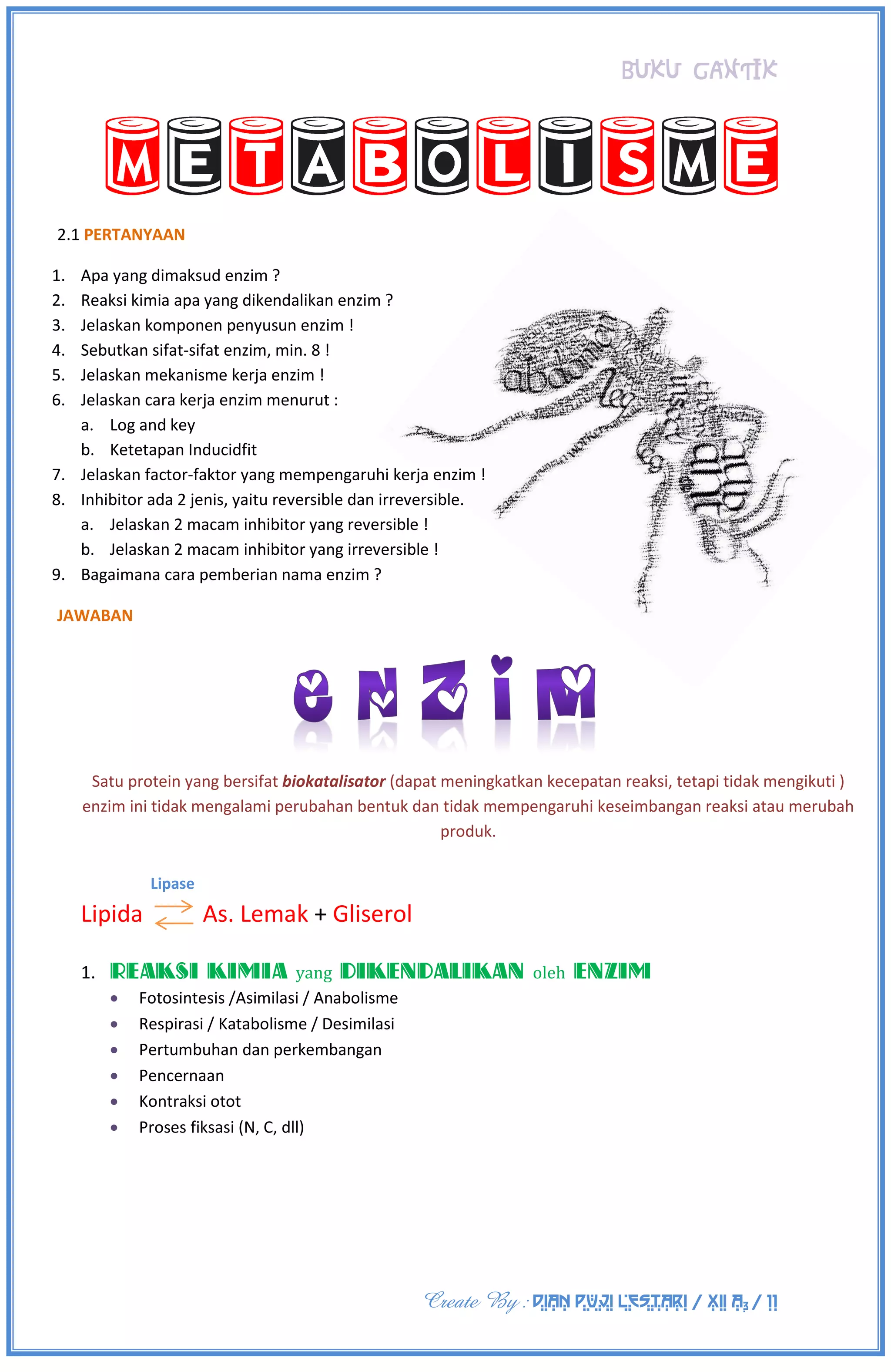Dokumen ini menjelaskan tentang enzim, termasuk definisi, reaksi kimia yang dikendalikan, komponen penyusun, mekanisme kerja, serta faktor-faktor yang mempengaruhi kemampuannya. Selain itu, juga dibahas tentang metabolisme sel, perbedaan antara anabolisme dan katabolisme, serta proses respirasi aerob dan anaerob, beserta langkah-langkah glikolisis dan siklus Krebs. Penamaan enzim dan jenis inhibitor juga dijelaskan secara rinci.