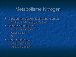 Metabolisme nitrogen melibatkan siklus yang kompleks untuk mensintesis dan mendegradasi nitrogen dalam bentuk protein, asam nukleat, dan senyawa nitrogen lainnya. Nitrogen diperoleh dari udara atau tanah, lalu diubah menjadi amonia sebelum disintesis menjadi senyawa organik melalui berbagai jalur seperti aminasi, pembentukan amida, dan sintesis arginin dan pirimidin. Kelebihan nitrogen diekskresikan dalam bentuk urea atau asam