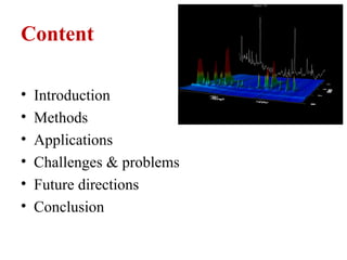 The document provides an overview of metabolomics, an emerging field focusing on the comprehensive study of low molecular-weight metabolites in biological samples and their alterations in disease states. It discusses the methodologies, applications, and challenges of metabolomics, emphasizing its potential in personalized medicine, particularly in oncology for early cancer detection and monitoring. Additionally, it highlights the integration of metabolomics with other 'omics' fields and the significance of bioinformatics in data analysis.