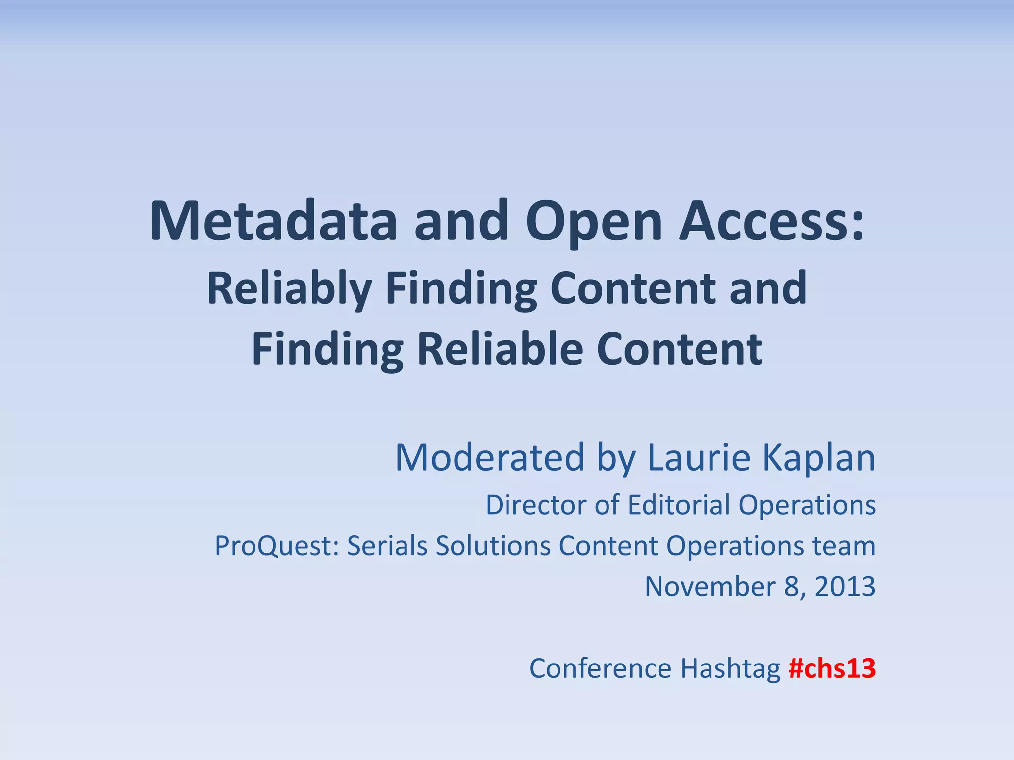 This document summarizes a presentation on metadata and open access content given at a conference. Sommer Browning from the Auraria Library discussed challenges with discovering and accessing open access materials using their systems. Better metadata is needed, including tags to identify open access resources and information to troubleshoot access problems. Jean-Claude Guédon from the University of Montreal also spoke as a researcher perspective. The presentation ended with a request to Serials Solutions to create a public Summon instance including all indexed open access content.