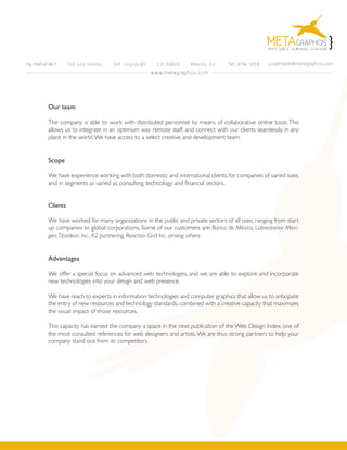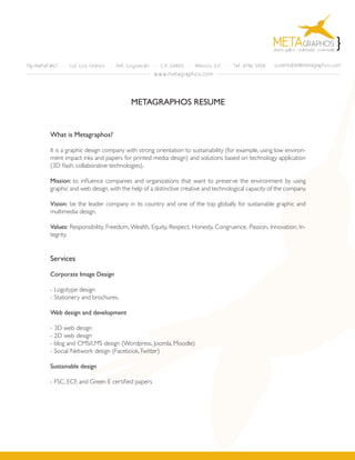 Metagraphos is a graphic design company focused on sustainability and technology applications. Their mission is to influence companies to use sustainable graphic and web design. They offer services including corporate image design, web design and development, and sustainable design using certified papers. Metagraphos has a distributed team that allows them to work seamlessly with remote staff and clients globally. They have experience working with both domestic and international clients across various industries.