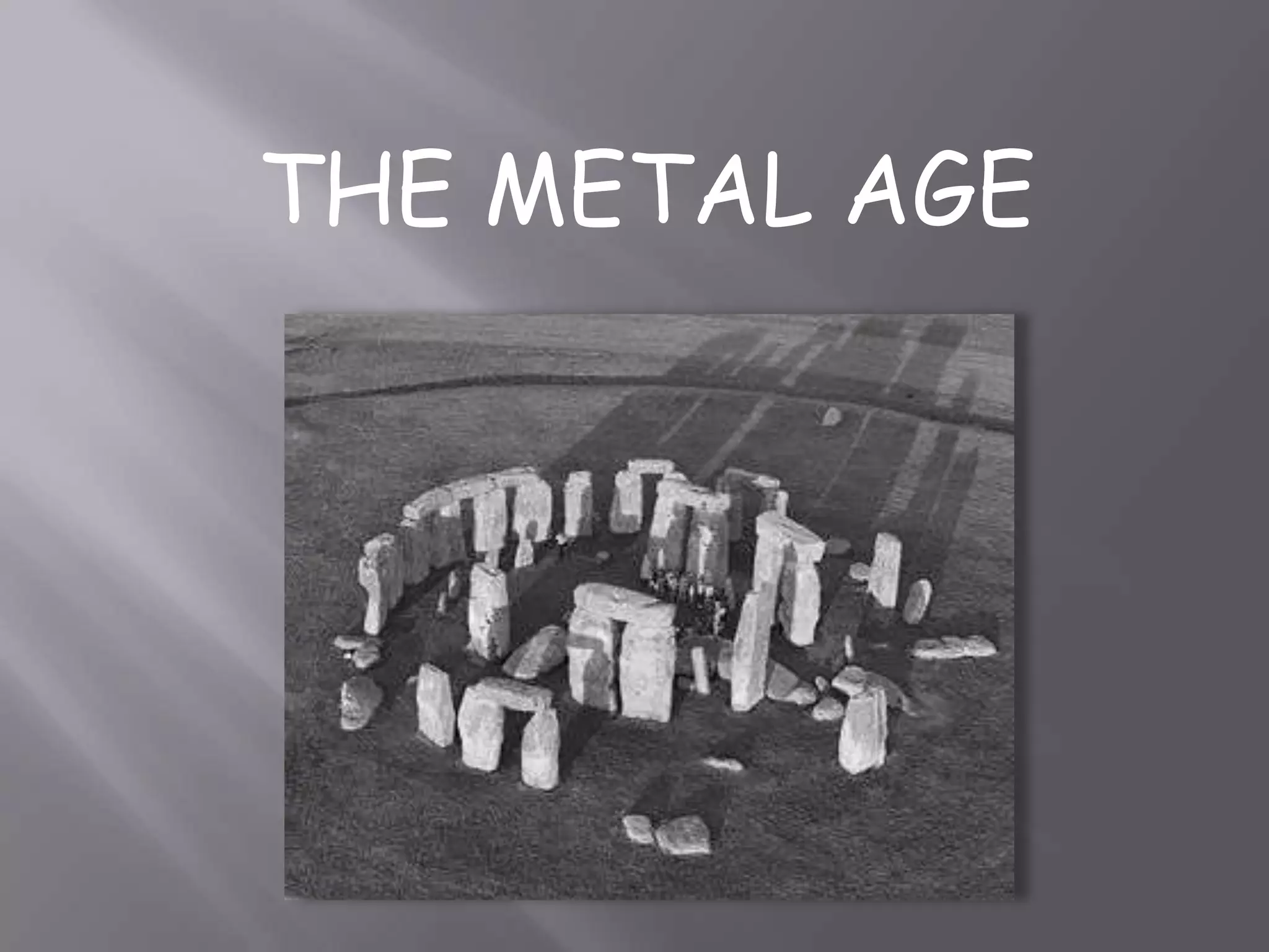Metallurgy was discovered around 4000 BC allowing for the extraction of metals from ores for processing. Society progressed through the Copper, Bronze, and Iron Ages as metalworking techniques advanced. During the Metal Ages, settlements grew in size and complexity with circular or rectangular dwellings surrounded by palisades. Economies centered around agriculture using new metal tools, livestock, trade, and specialized labor roles like metal artisans. People worshipped nature gods and held ceremonies. Defense structures like walls were built to protect villages from conflict and war. In Spain, important Metal Age cultures included the Copper Age Millares and Bell Beaker cultures, the Bronze Age El Argar culture, and the Bronze Age Talaiotic culture