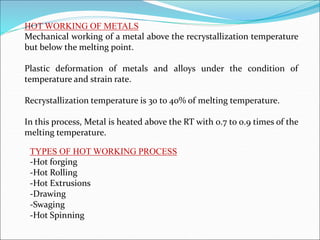 The document details metal forming processes, including hot and cold working techniques such as forging, rolling, drawing, and extrusion, with a focus on different methods and types for each process. It explains the principles behind each process, the machines used, and common operations involved, as well as potential defects in the final products. Detailed descriptions are provided for operations such as drawing, bending, forging, and various types of rolling, informing readers about their applications and significance in metalworking.