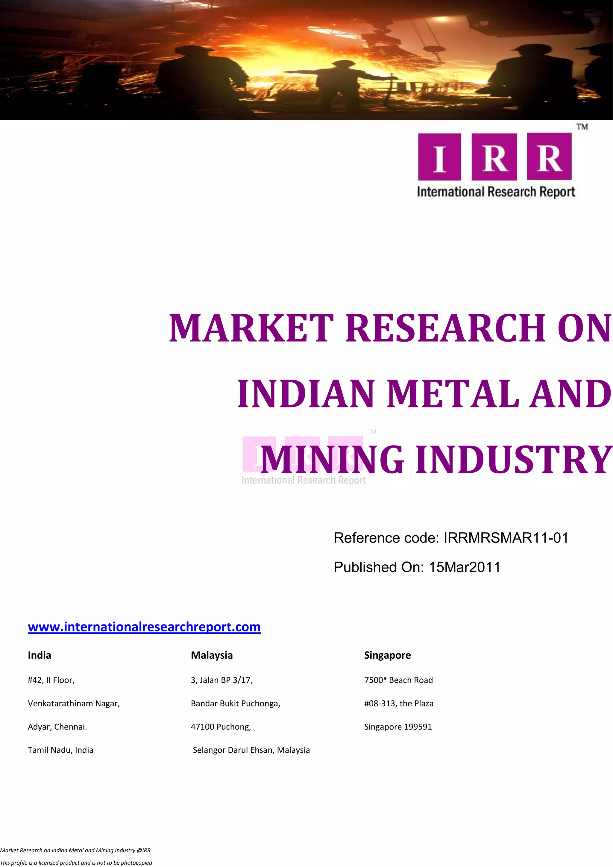 This document is a market research report on the Indian metal and mining industry published by International Research Report on March 15, 2011. The 40-page report provides an analysis of key segments of the industry like iron and steel, aluminum, and coal from 2005 to 2010. It also examines domestic demand trends, operational mines, exports, investments, major players, and the growth potential of important areas like steel and coal utilization and mining capacities. The report utilizes statistical data sets from 2000 to 2025 along with case studies to analyze industry patterns and factors driving growth.