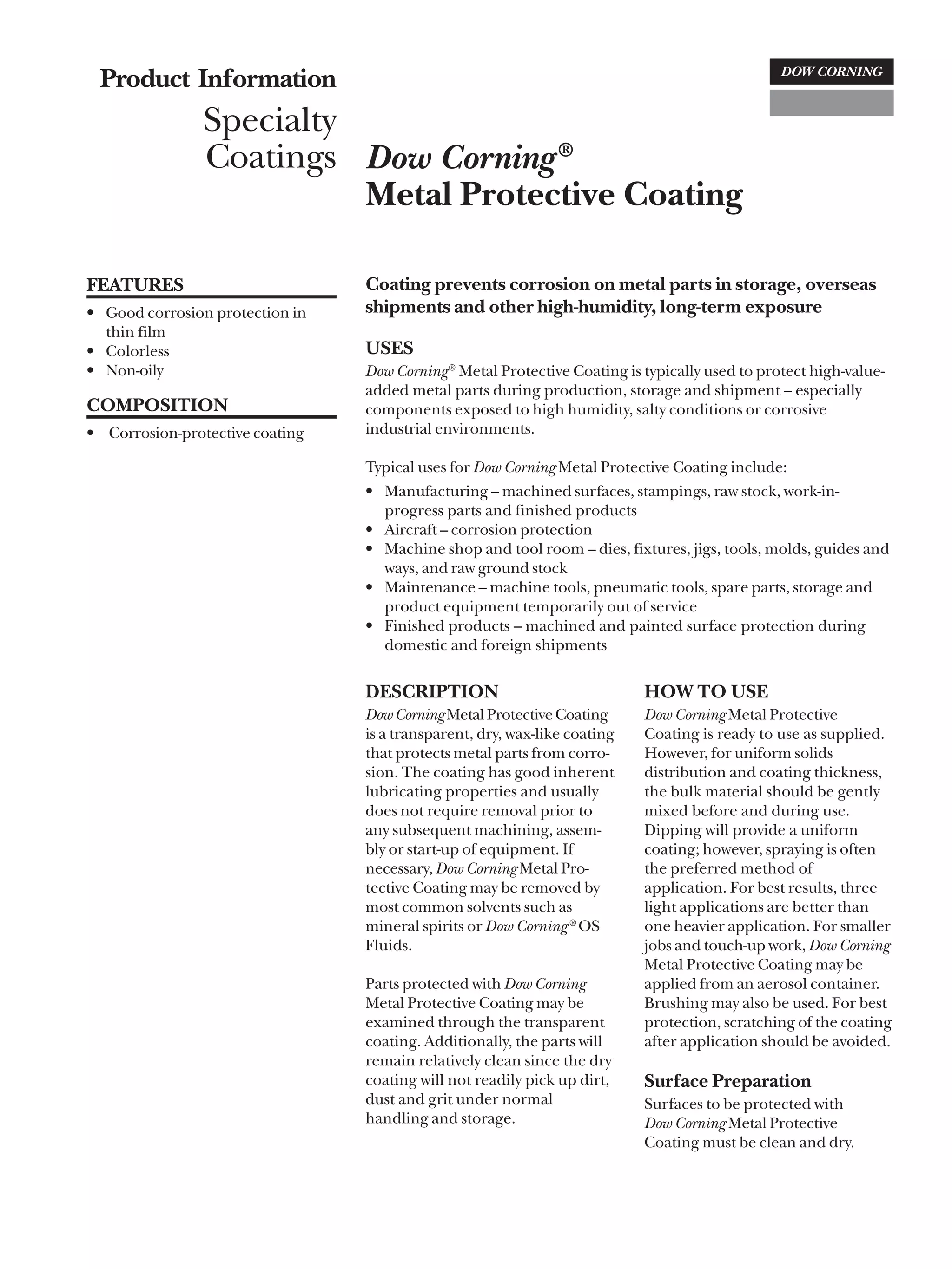 The document provides information about Dow Corning Metal Protective Coating, a transparent, dry, wax-like coating that protects metal parts from corrosion. It can be used to protect high-value metal parts during production, storage, and shipment, especially in humid or corrosive environments. The coating prevents corrosion, has good lubricating properties, and does not typically need to be removed before further processing. It can be applied by dipping, spraying, or brushing and builds up protection through multiple thin coats.