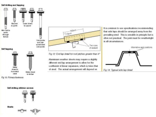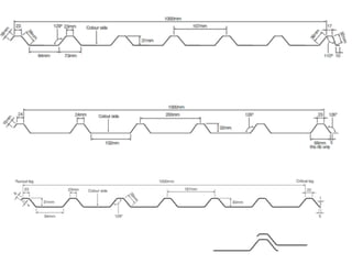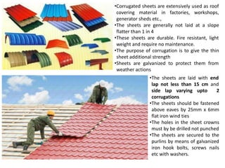 The document outlines the specifications and installation guidelines for corrugated sheet roofing, emphasizing their durability, fire resistance, and maintenance-free qualities. It details installation techniques, recommended overlaps, fastening methods, and considerations for purlin spacing based on roof pitch. Additional instructions for drilling, fixing, and preventing draughts are also provided to ensure proper assembly and performance of the roofing system.