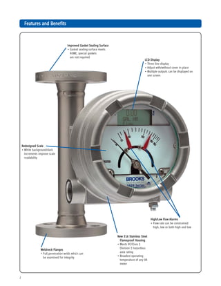 The Brooks MT3809 meter utilizes a variable area principle and is suitable for gas, liquid, and steam applications under high pressure and temperature conditions. It features a robust 316 stainless steel construction and offers versatile options like an LCD display, alarm functions, and various connection types for flexible installations. This meter is highly regarded for its reliability and performance in industrial applications, especially in hazardous environments.