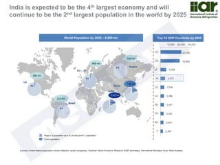 The document outlines India's economic projections, highlighting that it is expected to become the fourth-largest economy with a population estimate of 1.45 billion by 2025. It emphasizes the crucial role of cold chain infrastructure in improving the food processing industry and details government initiatives, including financial subsidies and policy frameworks to boost investments in this sector. The report also identifies challenges such as energy costs and the need for modernization in cold storage capacities, while indicating significant growth opportunities within the industry.
