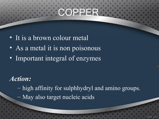 1. Copper and copper compounds like copper sulfate and copper subacetate are toxic heavy metals that can cause acute and chronic poisoning through ingestion, inhalation, or skin exposure.