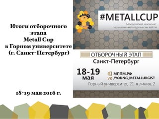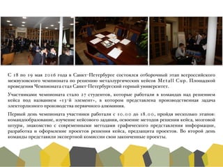 С 18 по 19 мая 2016 года в Санкт-Петербурге прошел отборочный этап всероссийского чемпионата Metall Cup, где 27 студентов работали над кейсом в области электролиза первичного алюминия. Команды представили проекты, оцененные экспертной комиссией по критериям технологии, экономики и социальной ответственности, а победитель будет представлять университет на финале чемпионата. По итогам круглого стола были предложены улучшения для будущего чемпионата, включая доработку брендбука и расширение количества отборочных этапов.