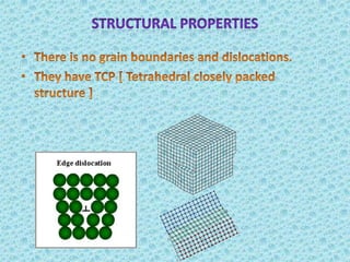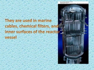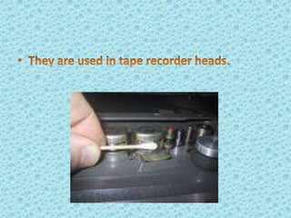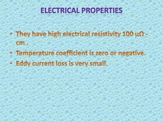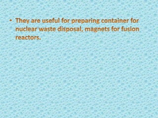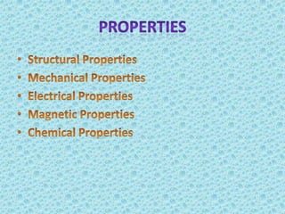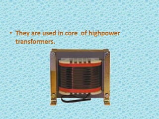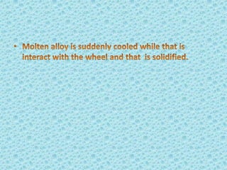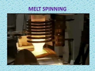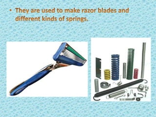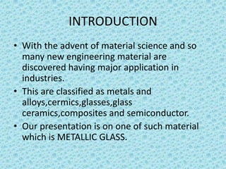 Metallic glass, an amorphous material with properties of both metals and glasses, has high strength, corrosion resistance, and good magnetic properties. It is produced by rapidly cooling molten metal, which prevents crystallization and allows for unique structural characteristics. Applications range from transformers and sensors to nuclear waste containers and surgical instruments, with potential future uses in personal electronics.