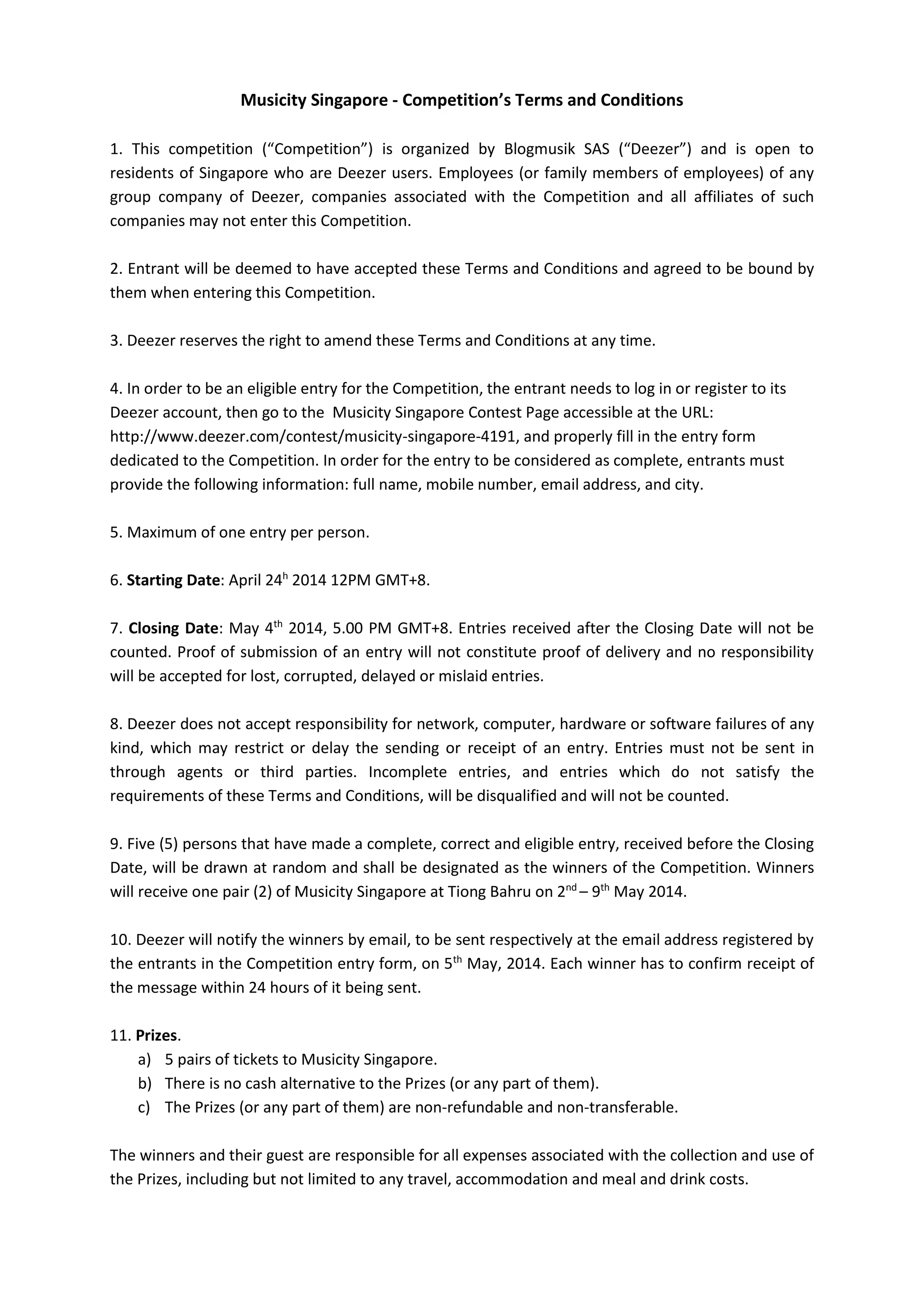1. The document outlines the terms and conditions of the Musicity Singapore competition organized by Deezer.