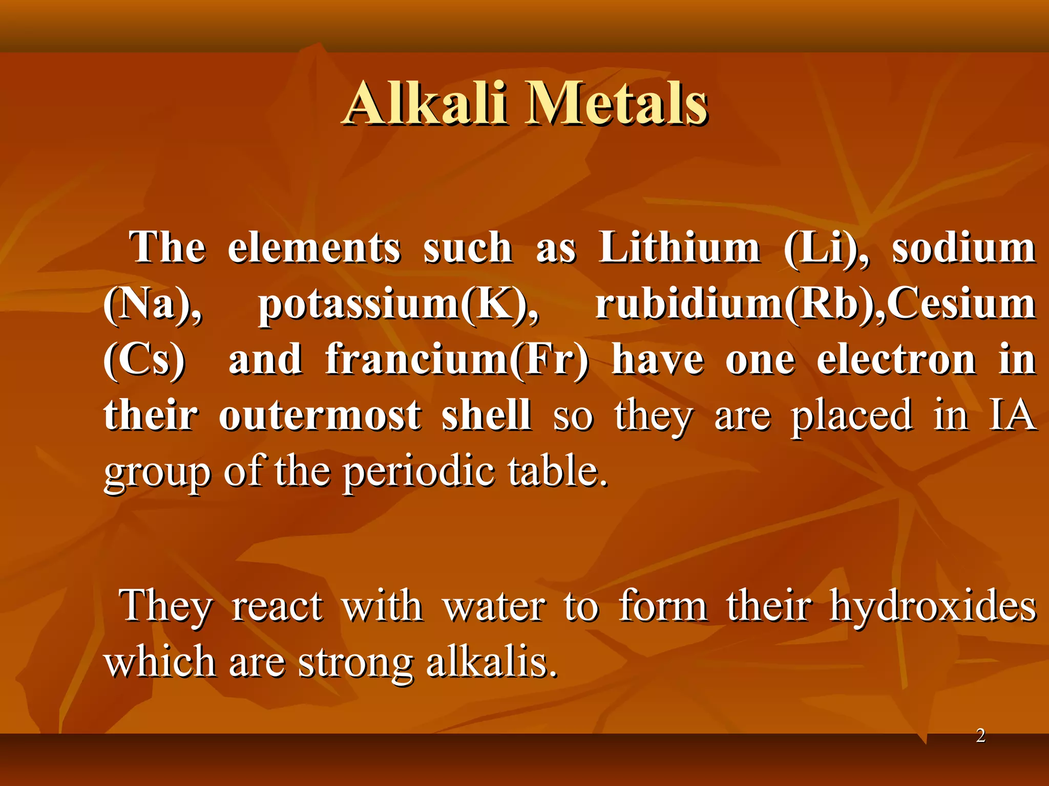 The document discusses alkali metals and alkaline earth metals. Alkali metals such as lithium, sodium, and potassium are placed in Group 1A of the periodic table and have one electron in their outermost shell. They react violently with water to form strong alkali hydroxides and hydrogen gas. Alkaline earth metals like beryllium, magnesium, and calcium are in Group 2A and have two outer electrons. They are less reactive than alkali metals but still react with water and acids to produce hydrogen. The reactivity of both groups increases down the respective groups.
