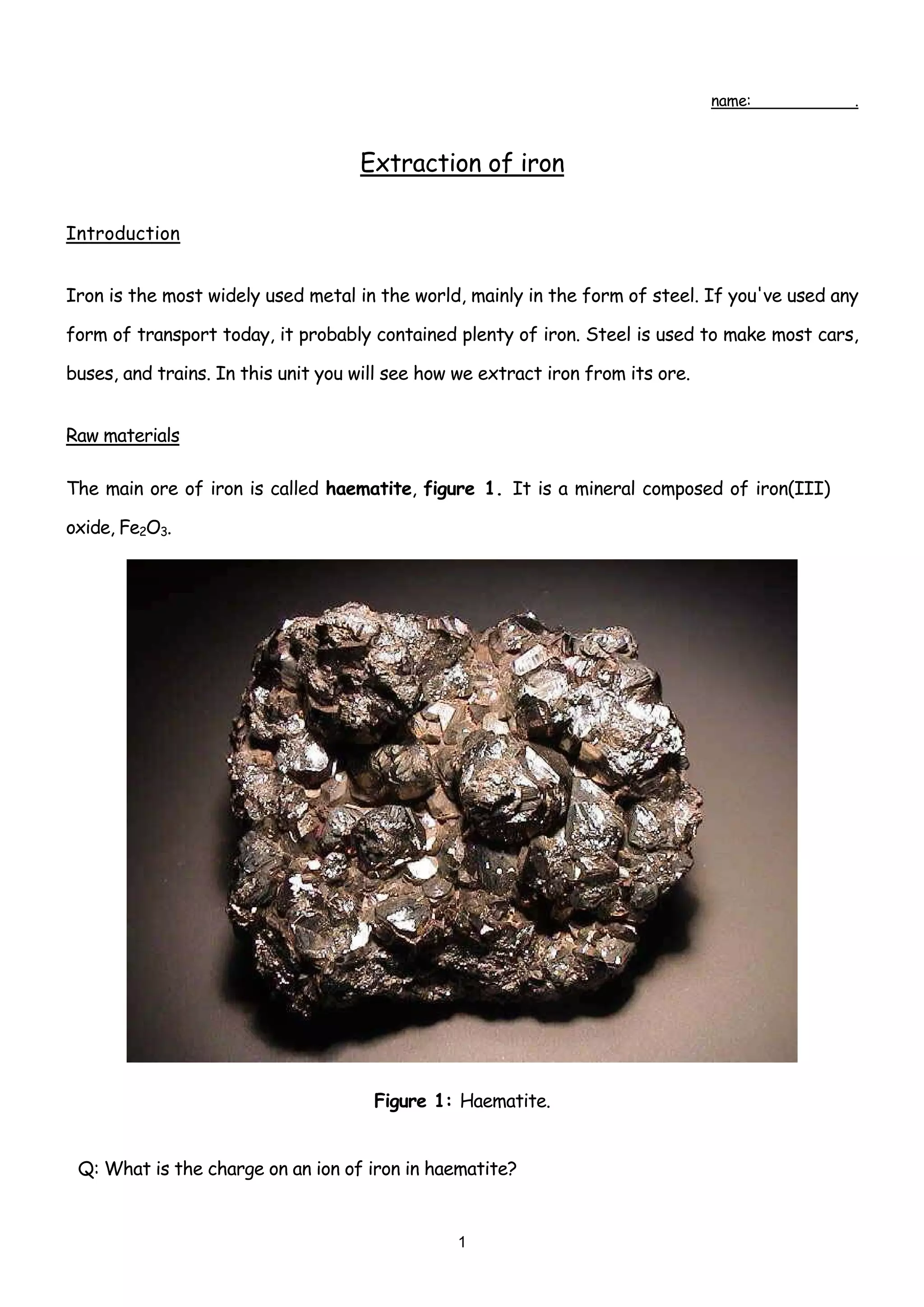 Iron is extracted from its main ore, haematite, in a blast furnace. Haematite, coke, and limestone are fed into the top of the blast furnace where temperatures reach 1500°C. The main reducing agent, carbon monoxide, reduces the iron(III) oxide to iron. The molten iron collects at the bottom and is tapped off, while the limestone removes sandy impurities to form a slag.