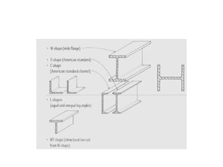 The document provides information about various metals used in construction, including their properties and common applications. Aluminum is discussed first, noting its light weight, corrosion resistance when anodized, and common uses in building elements like doors, windows and siding. Other metals covered include iron, steel, copper, brass and lead along with their characteristics and typical structural and architectural applications.