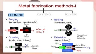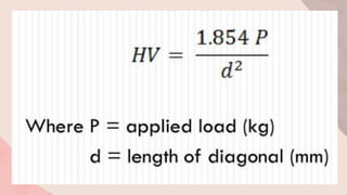 The document discusses mechanical properties of metals and testing methods. It covers various mechanical properties including strength, hardness, ductility, brittleness, toughness, elasticity, and plasticity. Common mechanical tests are also summarized such as tensile testing, hardness testing, impact testing, and fatigue testing. Standard specimens and procedures for tensile and hardness tests are described. True stress and strain are defined in relation to engineering stress and strain. The document also briefly mentions alloys and provides an example of Damascus steel.