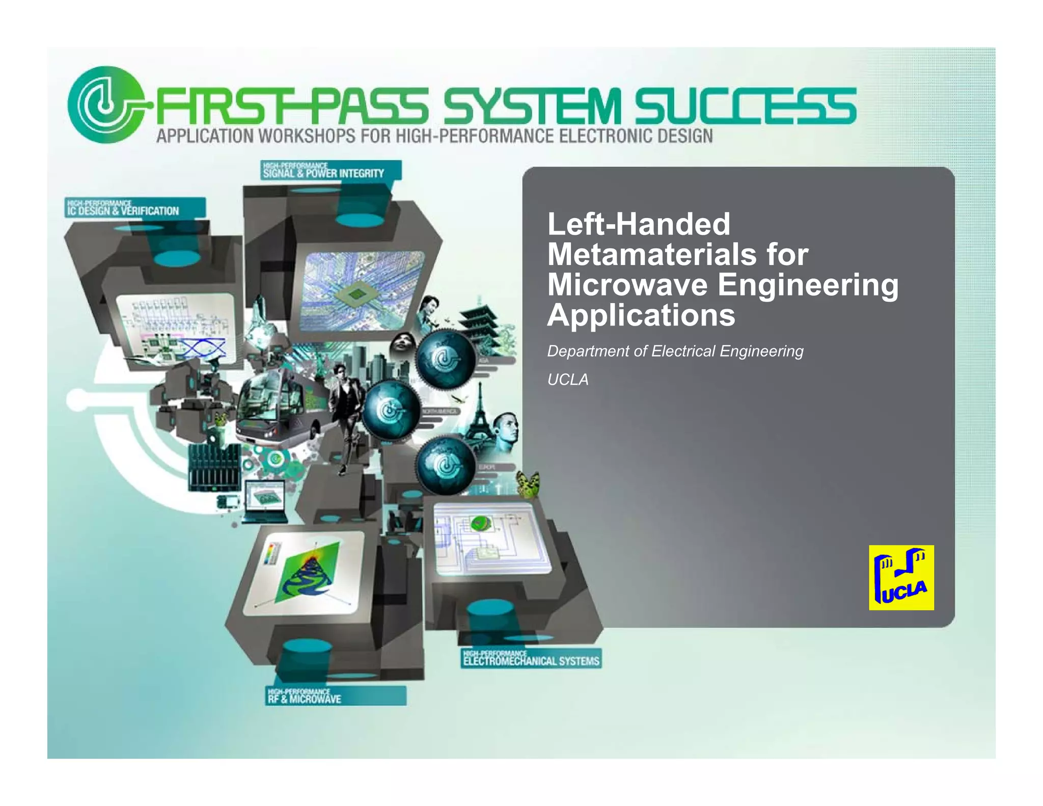 The document discusses left-handed metamaterials (LHMs) and their applications in microwave engineering. It introduces LHMs, including their defining properties of simultaneous negative permeability and permittivity. It describes two approaches to realizing LHMs - a resonant approach using split-ring resonators and a non-resonant transmission line approach. It then discusses composite right/left-handed metamaterials and their implementation using lumped element unit cells. Finally, it provides examples of metamaterial-based microwave devices like leaky-wave antennas that take advantage of the unique properties of LHMs.
