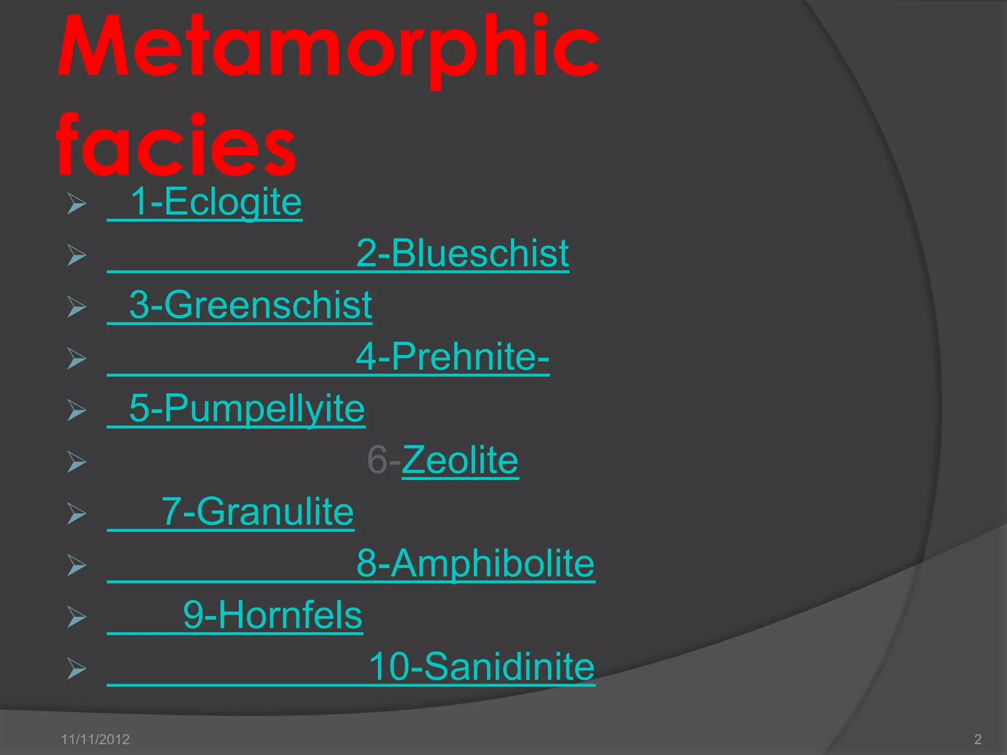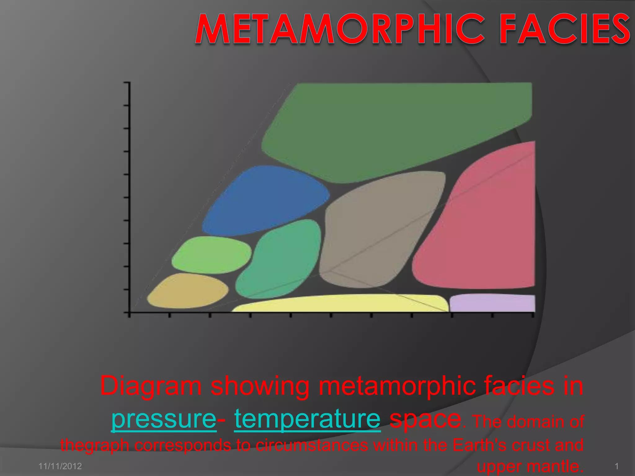 The document describes the different metamorphic facies defined by their mineral assemblages under varying pressure and temperature conditions within the Earth's crust and upper mantle. It outlines the key facies including zeolite, prehnite-pumpellyite, greenschist, amphibolite, granulite, blueschist, eclogite, albite-epidote hornfels, hornblende hornfels, pyroxene hornfels, and sanidinite facies. Each facies is characterized by index minerals and typical mineral assemblages that reflect the prevailing metamorphic conditions.