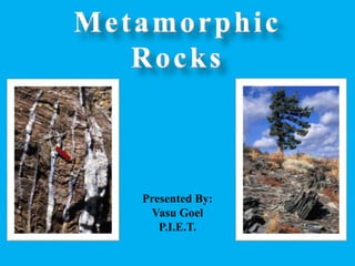 The document discusses different types of metamorphism including contact metamorphism, regional metamorphism, and cataclastic metamorphism. It also describes the agents of metamorphism including temperature, pressure, and water. Temperature can come from magma or increasing depth, while pressure includes lithostatic pressure from overburden and stress from tectonic forces. Metamorphism results in changes to mineral composition and texture of rocks.