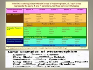 This document summarizes the metamorphism of different rock types including ultramafic, mafic, pelitic, and calcareous rocks. Ultramafic rocks like peridotite and serpentinite can transform into serpentine, anthophyllite, olivine, and pyroxene minerals. Mafic rocks like basalt metamorphose into amphiboles and chlorite at low grades and amphibolite at intermediate grades, and granulite at highest grades. Pelitic rocks contain chlorite, muscovite, quartz and albite. Calcareous rocks like limestone coarsen but change little, while impure limestone forms diverse calcium-magnesium-sil