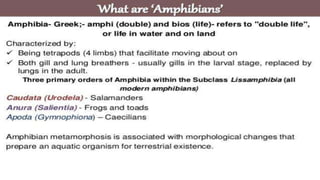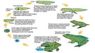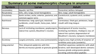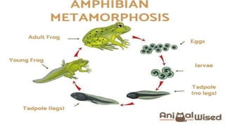 Metamorphosis is the process of transformation from larva to adult, involving significant changes in habitat, morphology, physiology, and behavior. It occurs in various metazoan phyla, with two main types: retrogressive metamorphosis seen in ascidians and progressive metamorphosis in amphibians and insects. Amphibians provide notable examples with ecological, morphological, and physiological changes influenced by hormonal control.