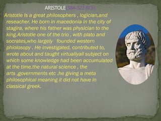 The document discusses prominent ancient philosophers, particularly Aristotle and Plato, detailing their contributions to Western philosophy and major philosophical concepts such as metaphysics, properties, and causation. It examines Aristotle's comprehensive exploration of various subjects and Plato's foundational influences on philosophy, including the establishment of the Platonic Academy. Additionally, the document reviews complex ideas in metaphysics including the nature of reality, abstract objects, and the relationship between parts and wholes.