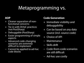 The document describes C# macros and attributes. It shows examples of defining macros to perform repetitive tasks inline and in a C-style loop. It also shows defining an attribute to add a timestamp property to a class at compile time.