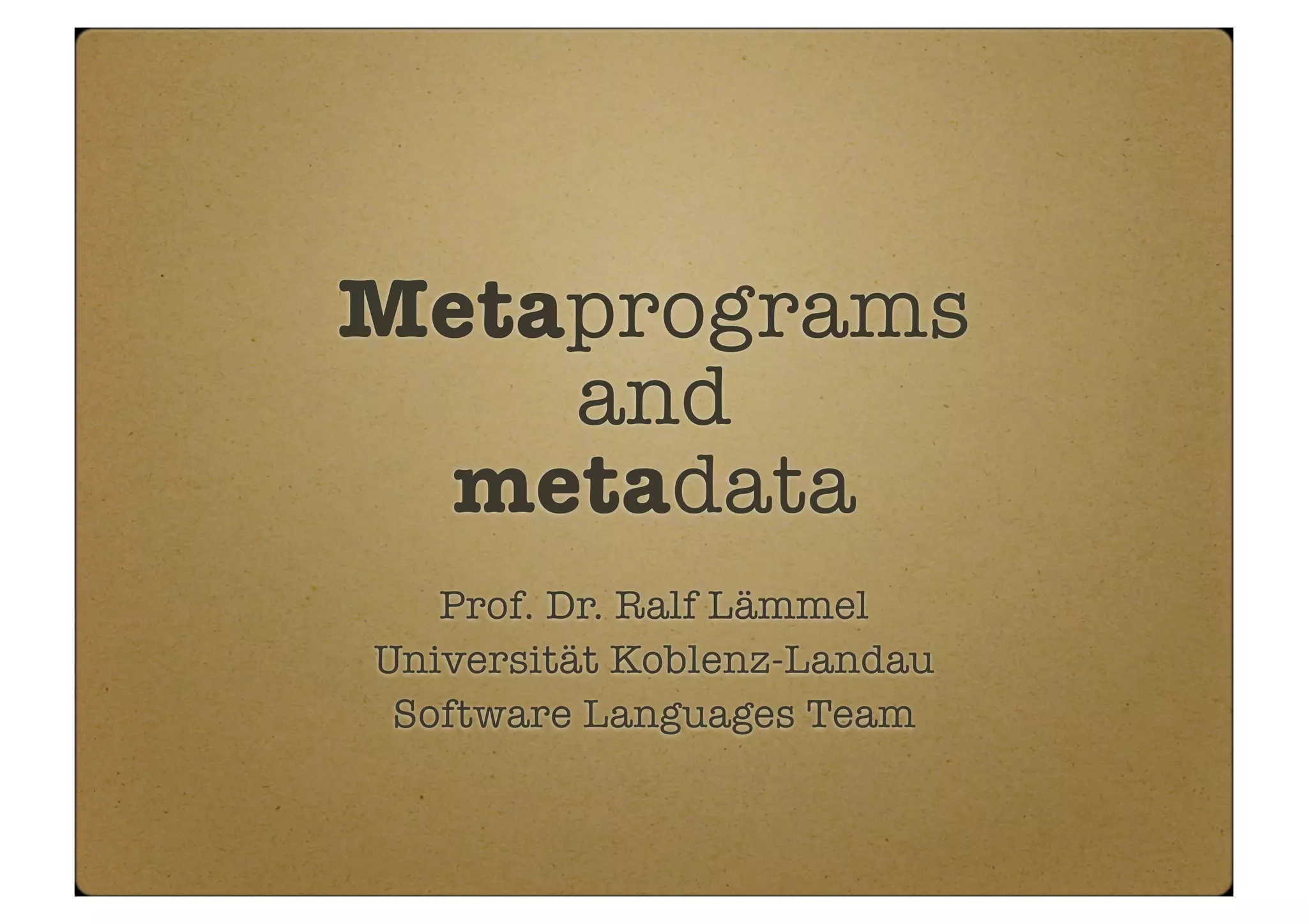 This document discusses metaprograms and metadata in Java. Metaprograms are programs that manipulate other programs, where programs correspond to data of metaprograms. Metadata is data that provides additional information about programs or other data. The document provides examples of using reflection and annotations in Java to implement metaprogramming and work with metadata. It also discusses using proxies to implement the proxy pattern reflectively in Java.