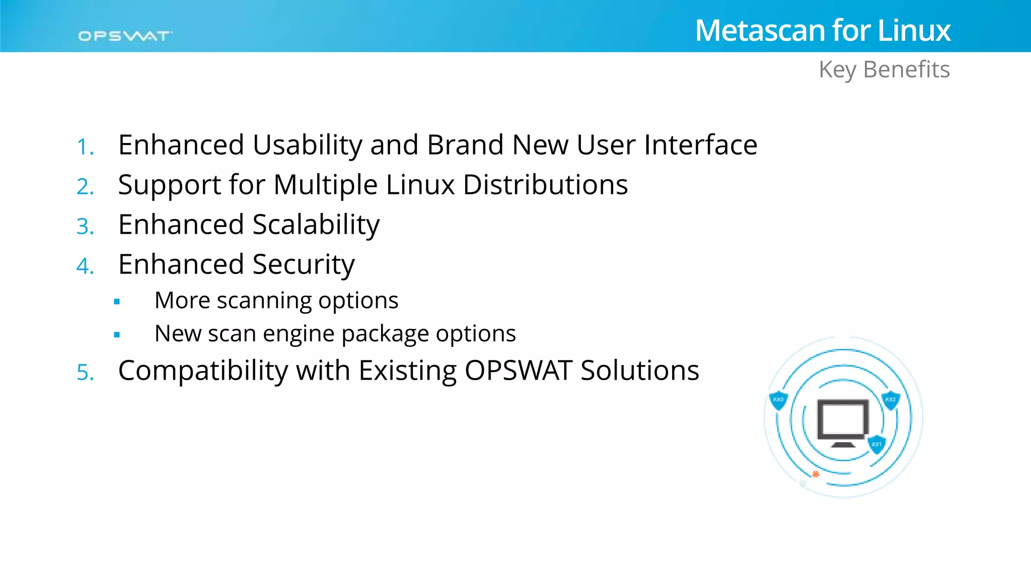 Metascan for Linux 2015 offers enhanced usability with a new user interface, support for multiple 64-bit Linux distributions, improved scalability, and security features. Key benefits include convenient installation, load balancing for high-volume scanning, and flexible scan workflows with various options for file types and sources. The system is compatible with existing OPSWAT solutions and allows for easy migration from Metascan for Windows.