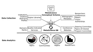 The document discusses the integration of conceptual models in research for a healthier academic community, highlighting the importance of data analysis and community engagement. It presents various methodologies for community analysis, including metrics and graph-based approaches to evaluate contributions and collaborations among researchers. Additionally, it addresses challenges such as paper classification and entity resolution, emphasizing the need for collaboration in overcoming these obstacles.