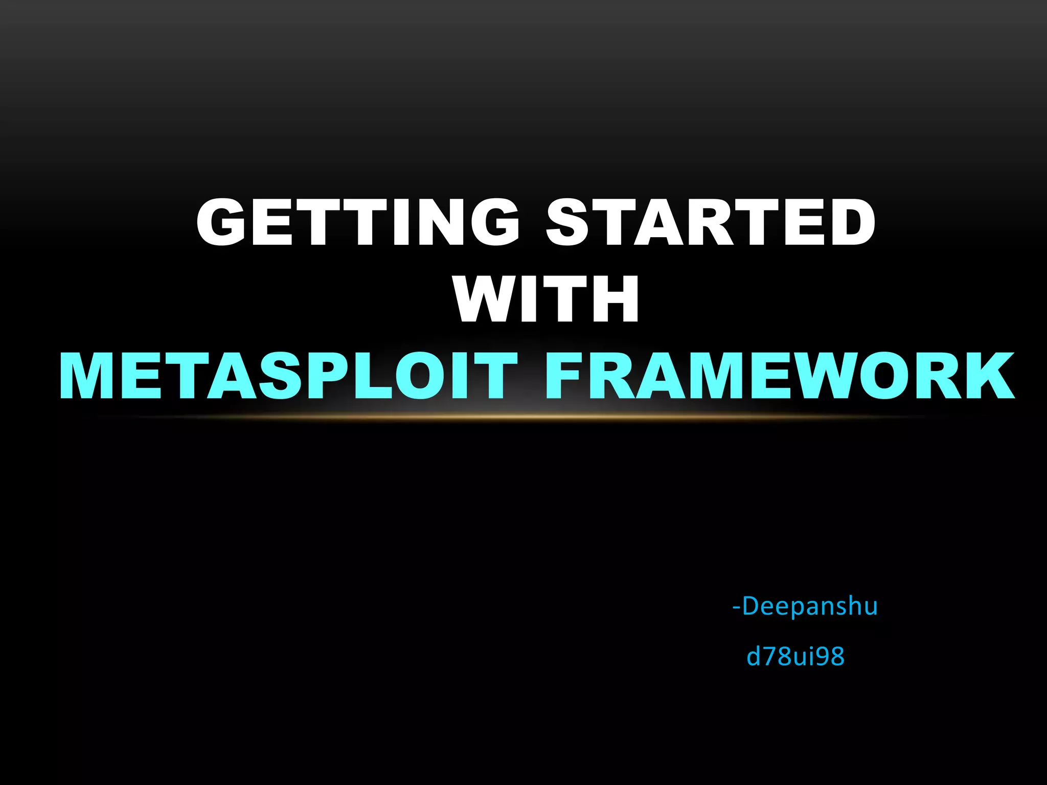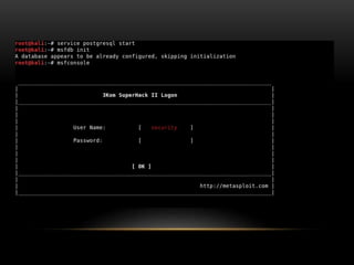 The document provides an overview of the Metasploit Framework, an open-source exploitation tool used for penetration testing and research. It covers its history, architecture, basic terminologies like vulnerabilities, exploits, and payloads, and includes practical demonstrations of using Metasploit for various attacks. The document also emphasizes prevention measures against such attacks and encourages questions from the audience.