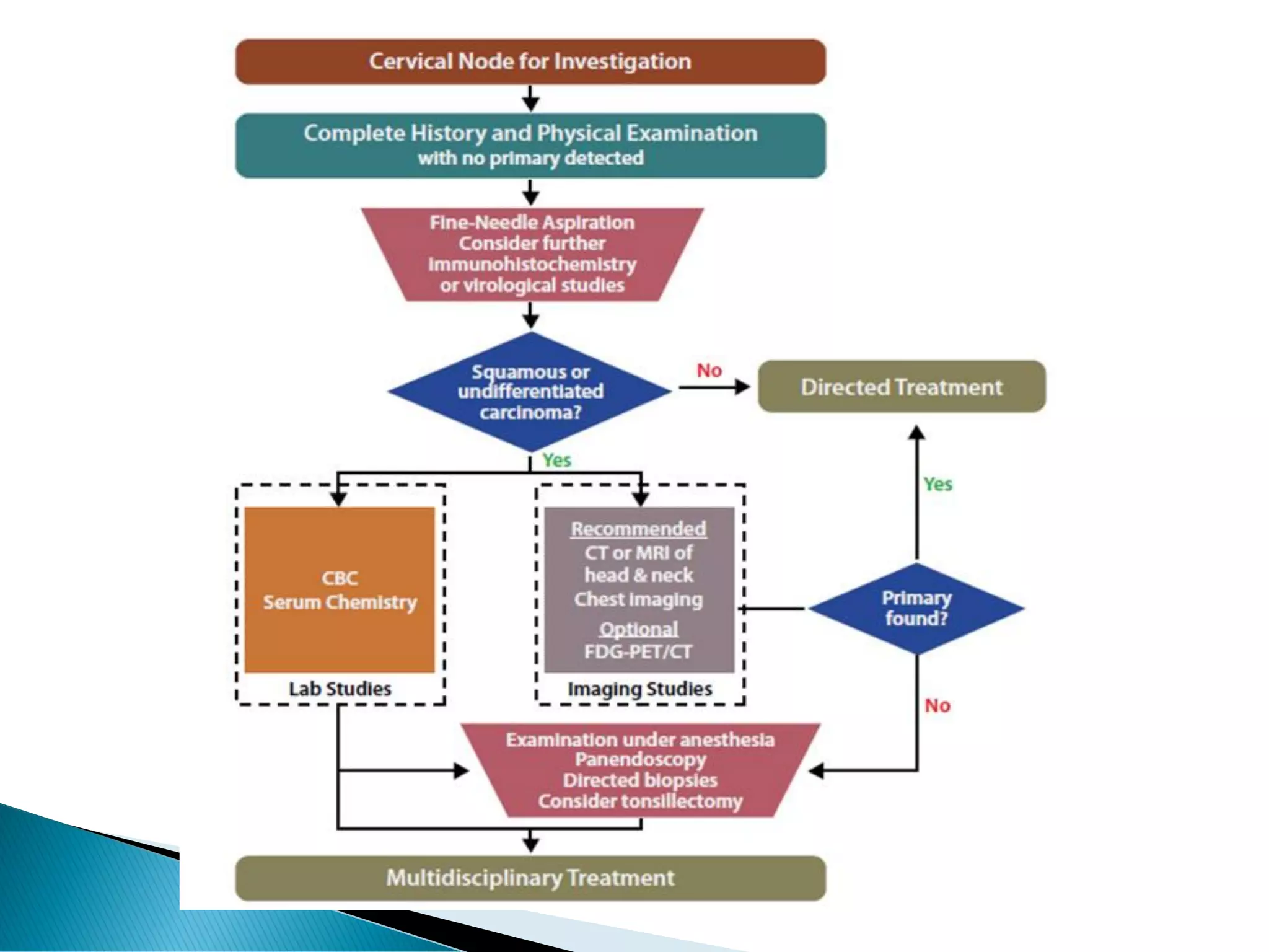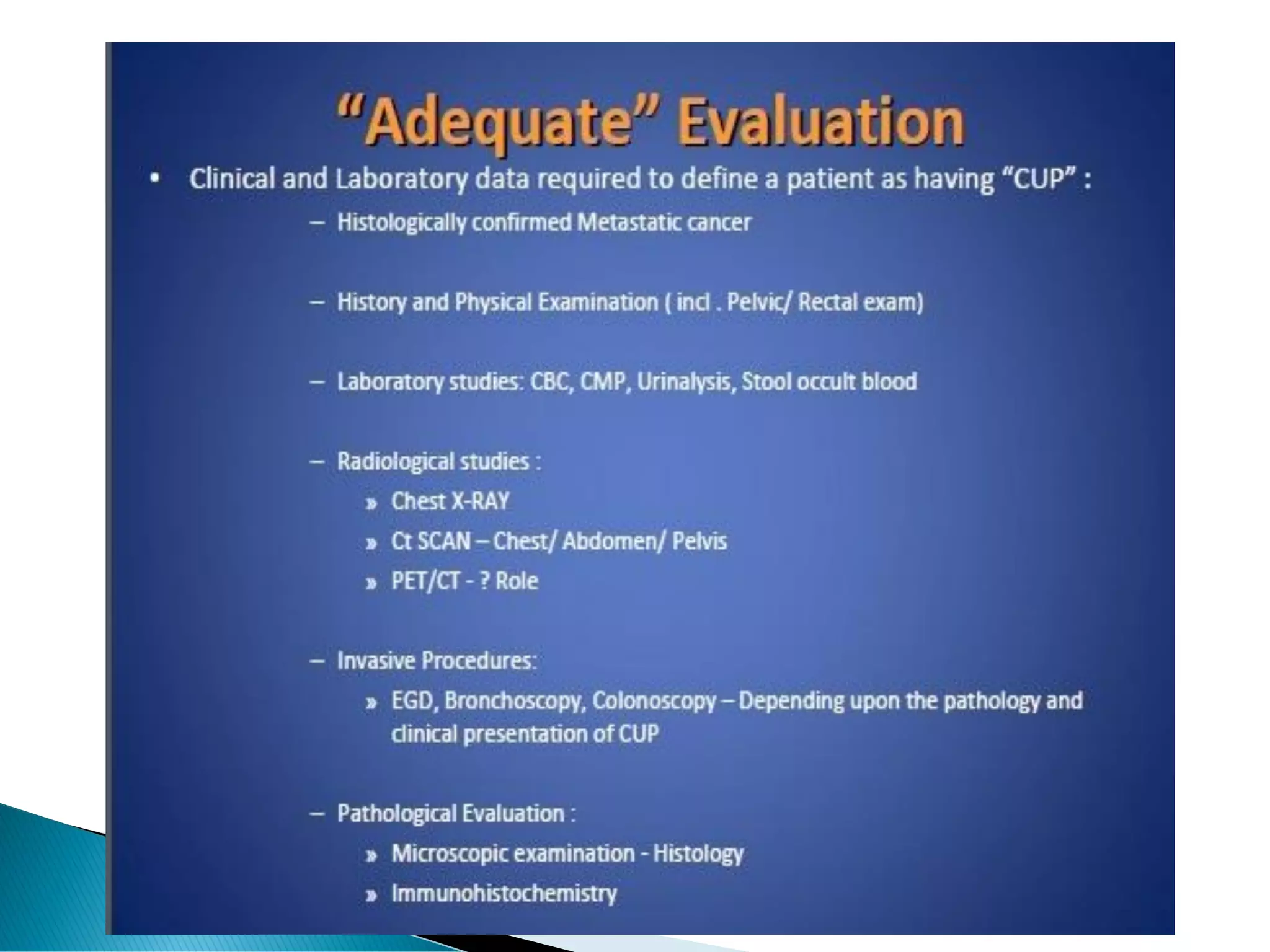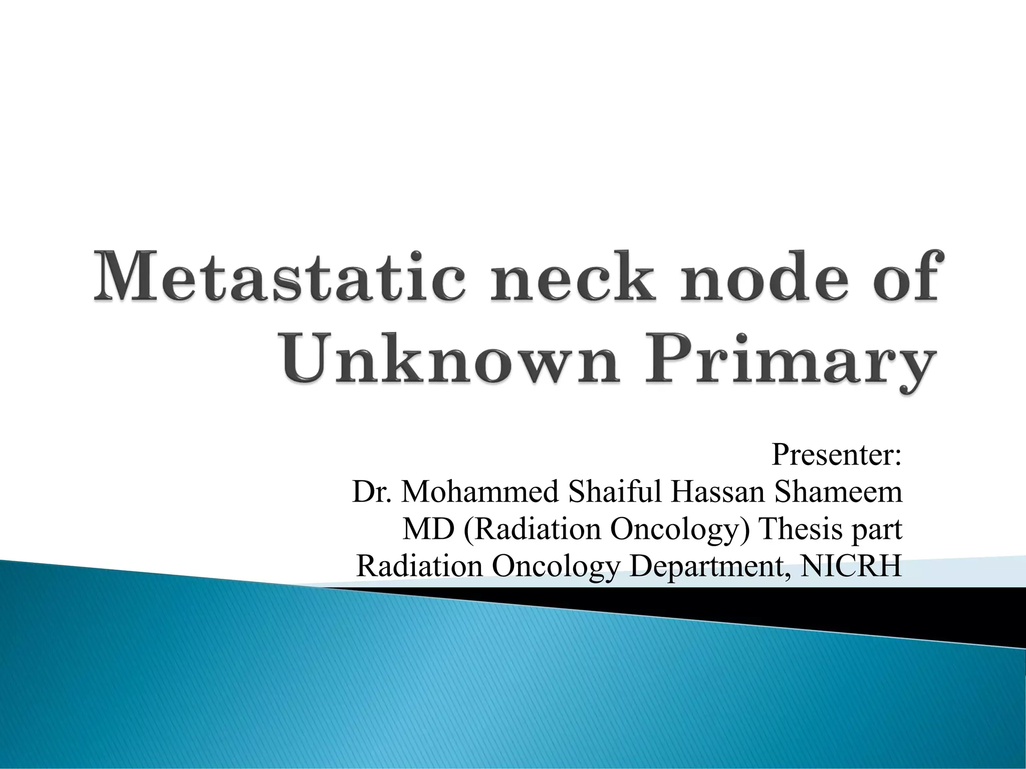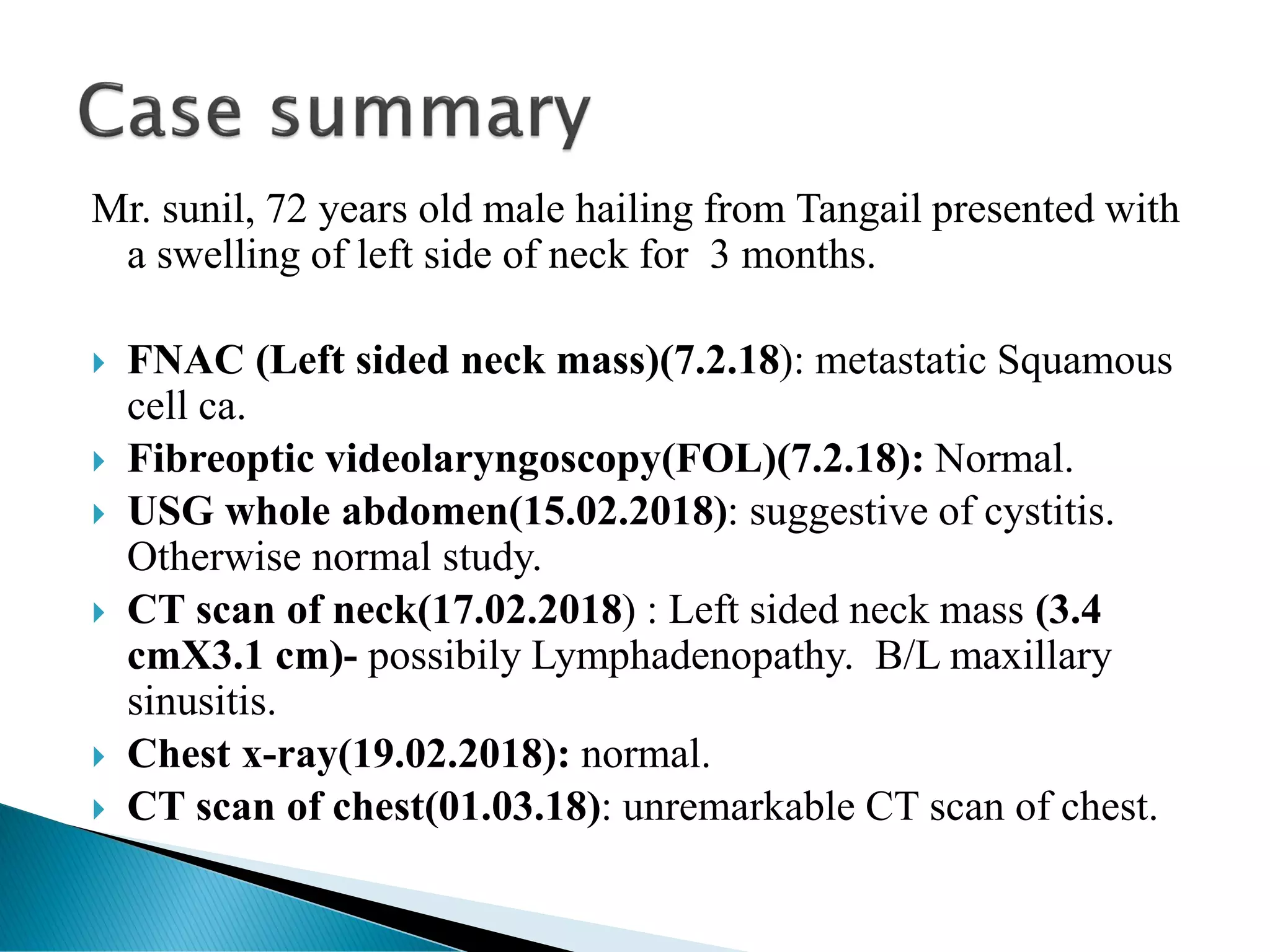Mr. Sunil, a 72-year-old male, presented with a 3-month history of a left neck swelling. Further examinations revealed metastatic squamous cell carcinoma in the left neck lymph nodes. He was diagnosed with carcinoma of unknown primary (CUP) and underwent radical neck dissection, followed by chemotherapy and radiotherapy. CUP describes metastatic cancers where the primary site cannot be identified despite various examinations and evaluations. Treatment options for CUP include surgery, radiation therapy, chemotherapy, or concurrent chemoradiation depending on the lymph node involvement and other factors. Prognosis depends on the stage and presence of extracapsular extension, with 5-year survival rates ranging from 30% for upper cervical nodes to 5%