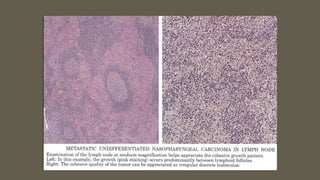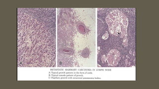 The document discusses metastasis to lymph nodes, focusing on its incidence, differentiation from lymphoma, and the significance of lymph node assessment for cancer staging. It highlights the TNM staging system and the role of lymph nodes in determining the extent of cancer, including various primary tumor sites and their association with lymphatic spread. Additionally, it describes methods to distinguish between lymphomas and malignant carcinomas using various staining techniques and immunocytochemistry.