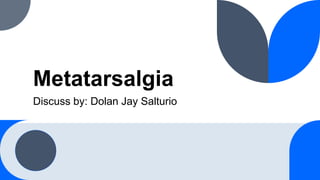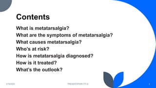 Metatarsalgia is a painful inflammation of the ball of the foot caused by overuse from high-impact sports, ill-fitting shoes that put pressure on the metatarsal bones, or underlying foot issues. Symptoms include pain in the ball of the foot that gets worse with activity. Treatment focuses on rest, orthotics, pads and changes to activities and footwear. For most cases, conservative care relieves pain, but surgery may be needed in severe cases to realign bones causing persistent pain.