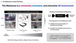The document discusses three key aspects of the metaverse: the importance of presence, the role of virtual reality (VR), and the market potential. It emphasizes that presence is the core experience of the metaverse, which is being driven by affordable and high-performance VR technologies like the Quest 2. Additionally, it notes that while the hype around the metaverse suggests a vast market, the current addressable market is more modest, with VR expected to grow significantly in the next few years.