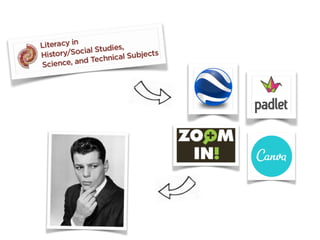 This document discusses tools for integrating social studies and literacy standards using technology. It provides examples of tools like Padlet for collaborative document analysis, Thinglink for web-based historical thinking, and Canva for web-based storytelling. These tools allow students to analyze and evaluate evidence from multiple sources, support claims with evidence, and design presentations to deliver arguments on topics. The document also includes questions teachers could ask students to integrate skills like gathering evidence and making arguments about compelling topics.