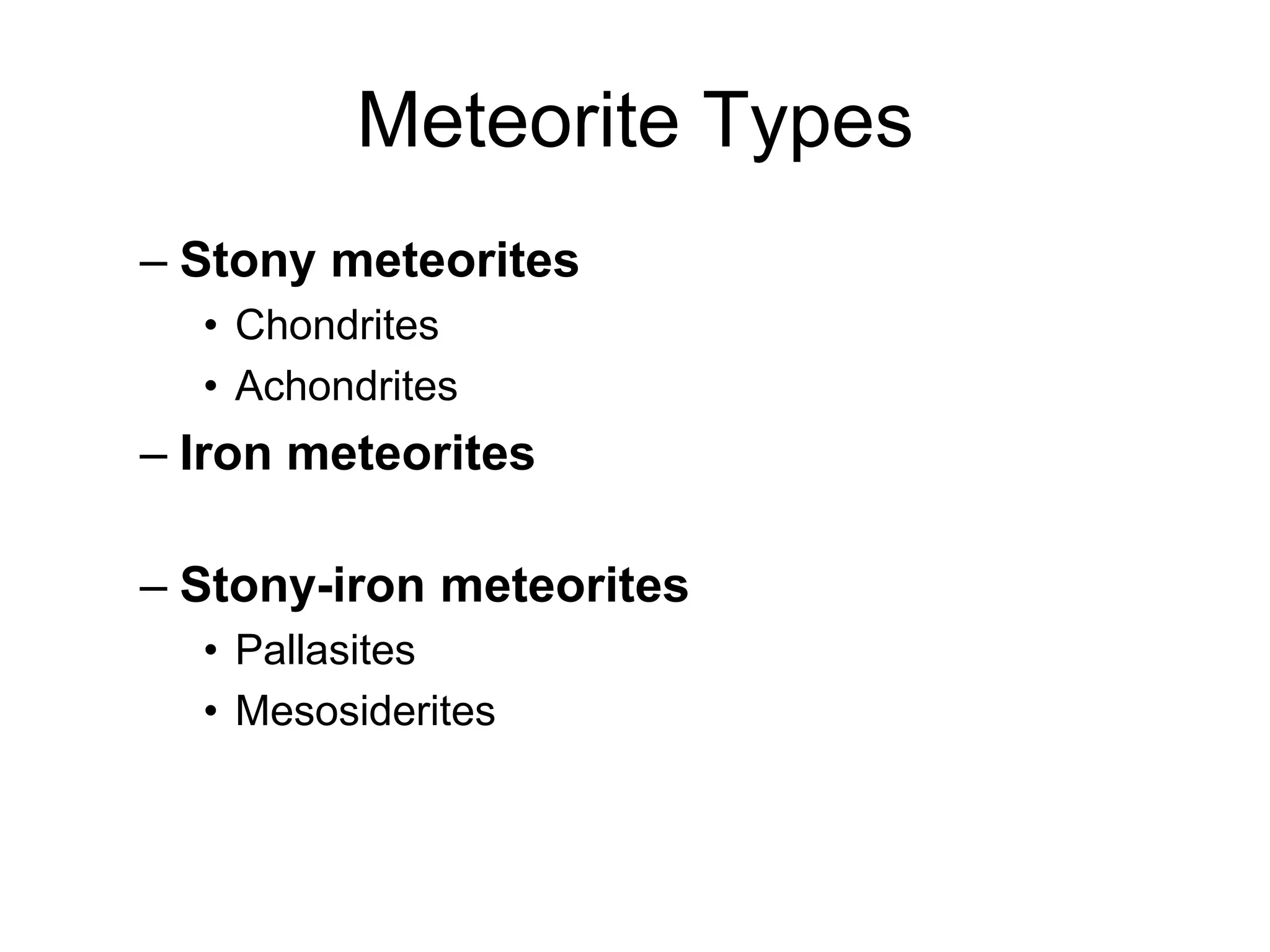 The document details various types of meteorites, including stony meteorites (chondrites and achondrites), iron meteorites, and stony-iron meteorites, highlighting their composition and origins. It discusses the significance of the Chixculub impact and its connection to the Cretaceous-Tertiary extinction event, noting the evidence of iridium from meteorites. Additionally, it lists major impact craters around the world, emphasizing the prevalence of such geological features.