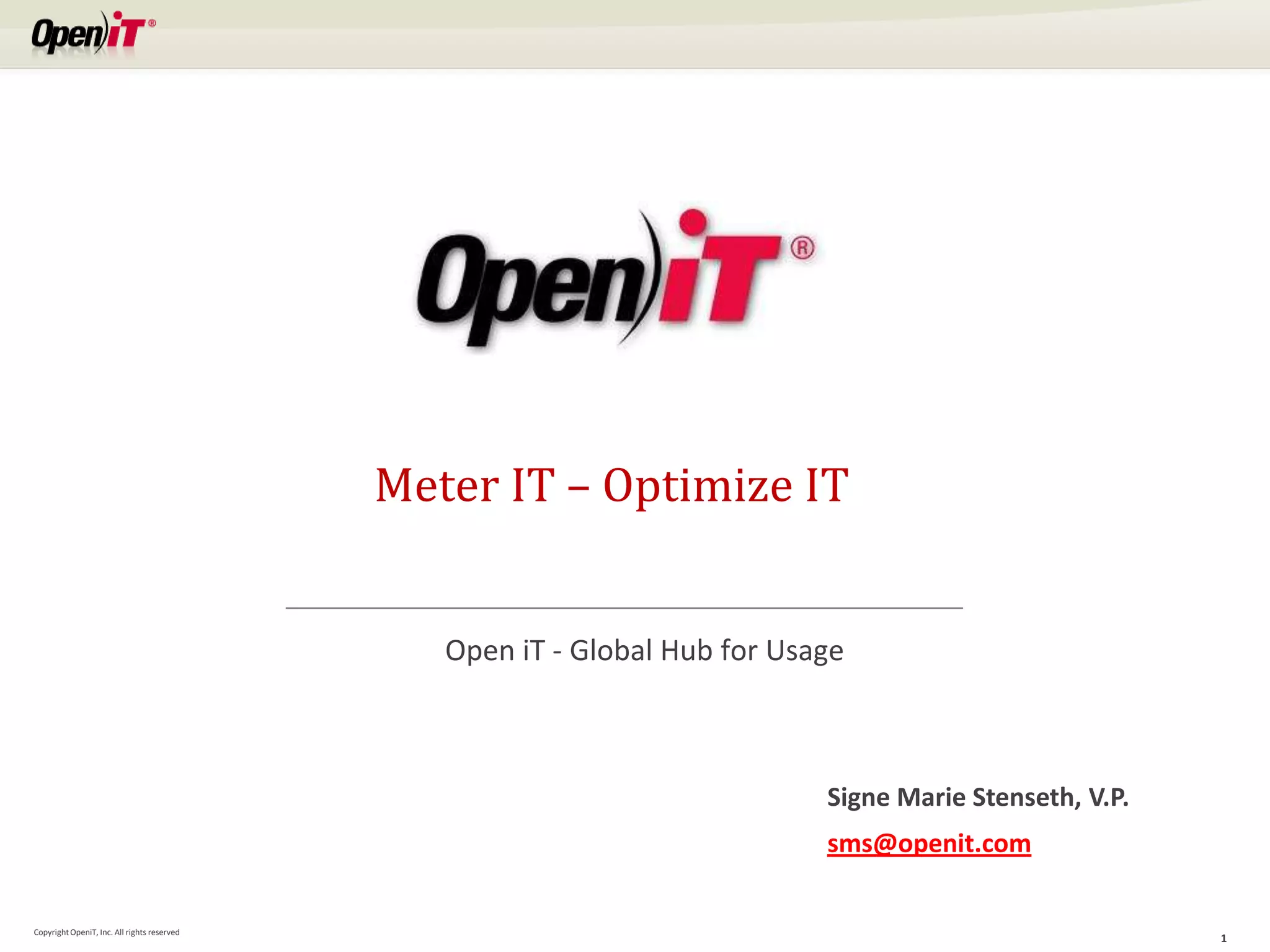Open iT is an independent software vendor that provides metering and optimization solutions to help customers justify IT investments based on measurable usage data. Their tools provide multiple views of software usage data to identify optimization opportunities, such as standardizing processes, consolidating licenses, and renegotiating agreements with vendors. Customers report significant cost savings from leveraging Open iT's usage analytics and rules-based license management framework.