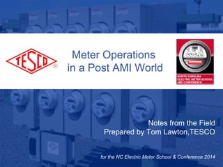The document discusses the evolving role of meter operations in the wake of advanced metering infrastructure (AMI) deployments. It highlights the challenges and changes utilities face, including a shift from electro-mechanical to electronic meters, the importance of meter communication and data management, and the need for skilled personnel as traditional roles diminish. The presentation also emphasizes the necessity for ongoing testing, certification, and the adaptation of meter departments to manage more complex technology requirements.