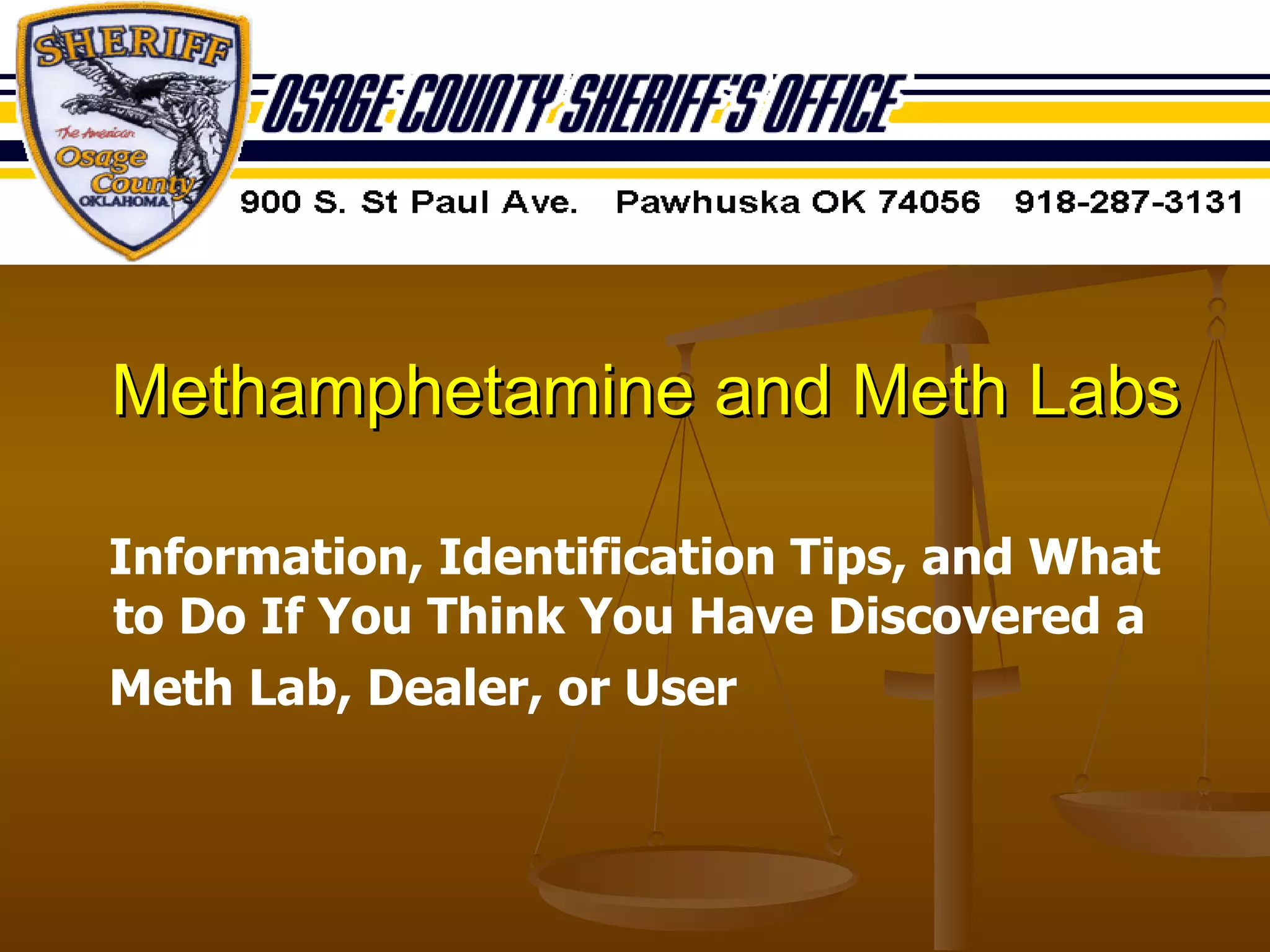 This document provides information about methamphetamine (meth), including what it is, how it's ingested, common signs of meth use, and how to identify a potential meth lab. Meth comes in various forms and is often snorted, smoked, or injected for its euphoric and energizing effects. Long term meth use can cause physical and psychological harm. Clandestine meth labs are dangerous and produce toxic waste. The document outlines physical and behavioral signs that may indicate meth use or production and advises contacting authorities instead of confronting a suspected user or lab.