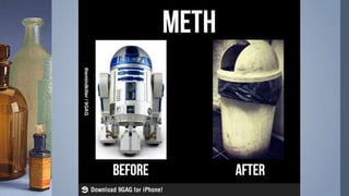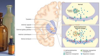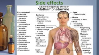 Methamphetamine is a highly addictive psychostimulant that affects the central nervous system. It causes the release of neurotransmitters like dopamine and activates the cardiovascular and nervous systems. While it is prescribed to treat conditions like ADHD and obesity in limited cases under the brand name Desoxyn, methamphetamine is more commonly abused as an illegal street drug known as "ice" or "crystal" that produces feelings of euphoria. Long term meth abuse is associated with severe health risks and addiction.