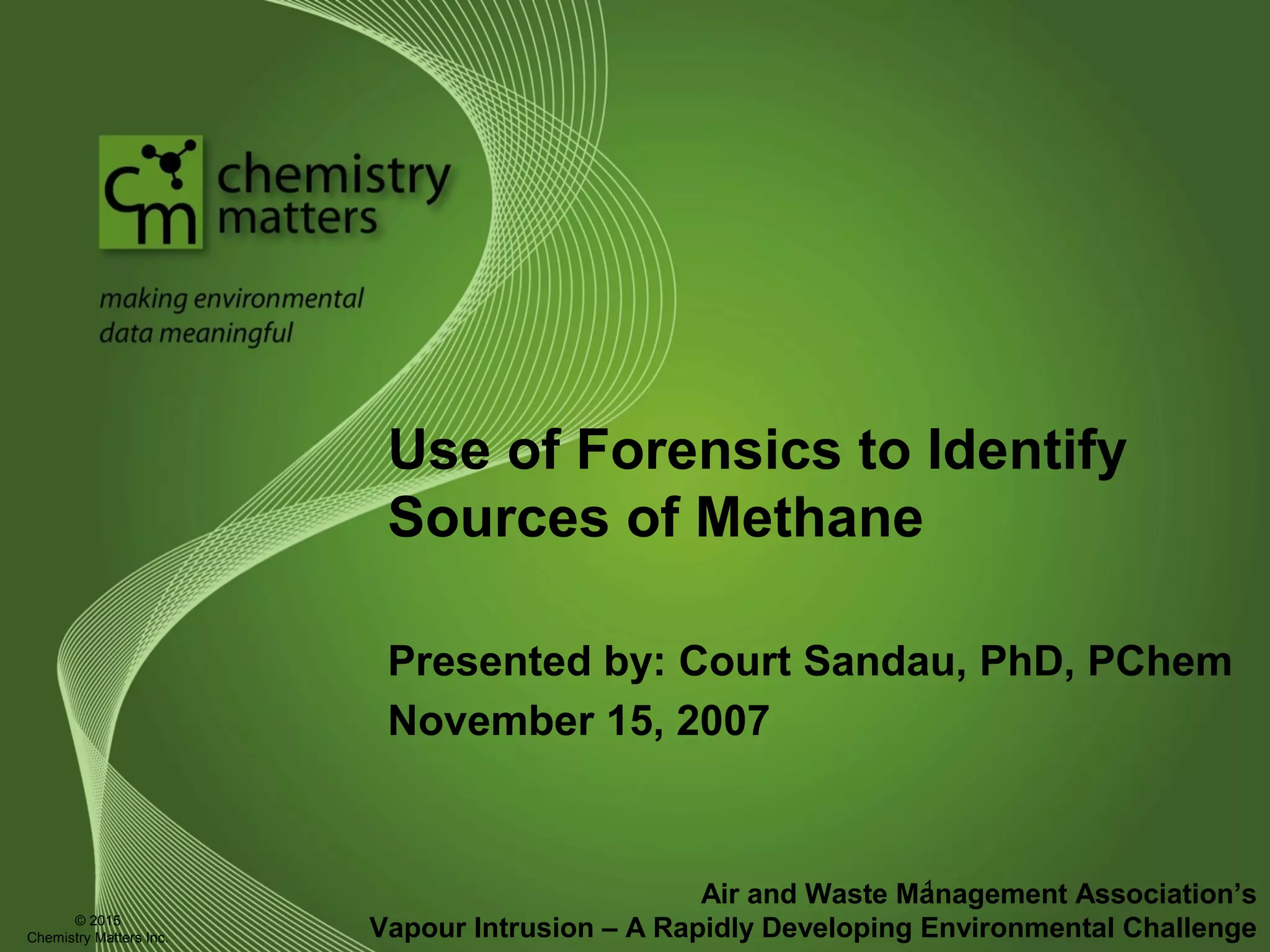 The document discusses using forensic techniques to identify sources of fugitive methane found in subsurface soils in a municipality. Level 1 analysis using fixed gas composition, hydrocarbon fingerprinting, and VOC analysis ruled out thermogenic sources but could not differentiate between landfill and sewage sources. Level 2 analysis using carbon dating, and stable isotope analysis of methane indicated one sampling point was likely degrading landfill material and another was a mixed source of landfill and organic soils. The analysis identified potential methane sources to help the client determine appropriate actions.