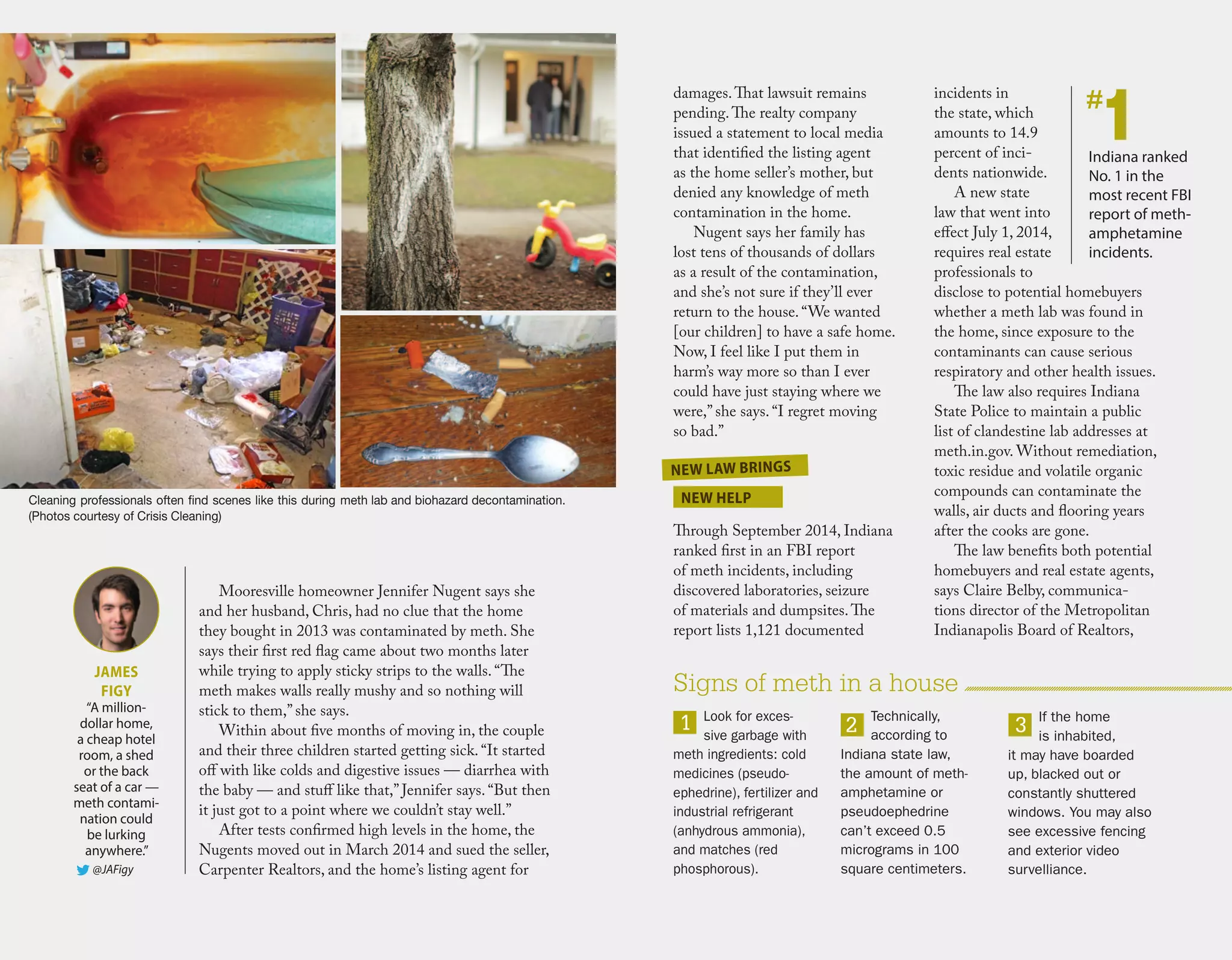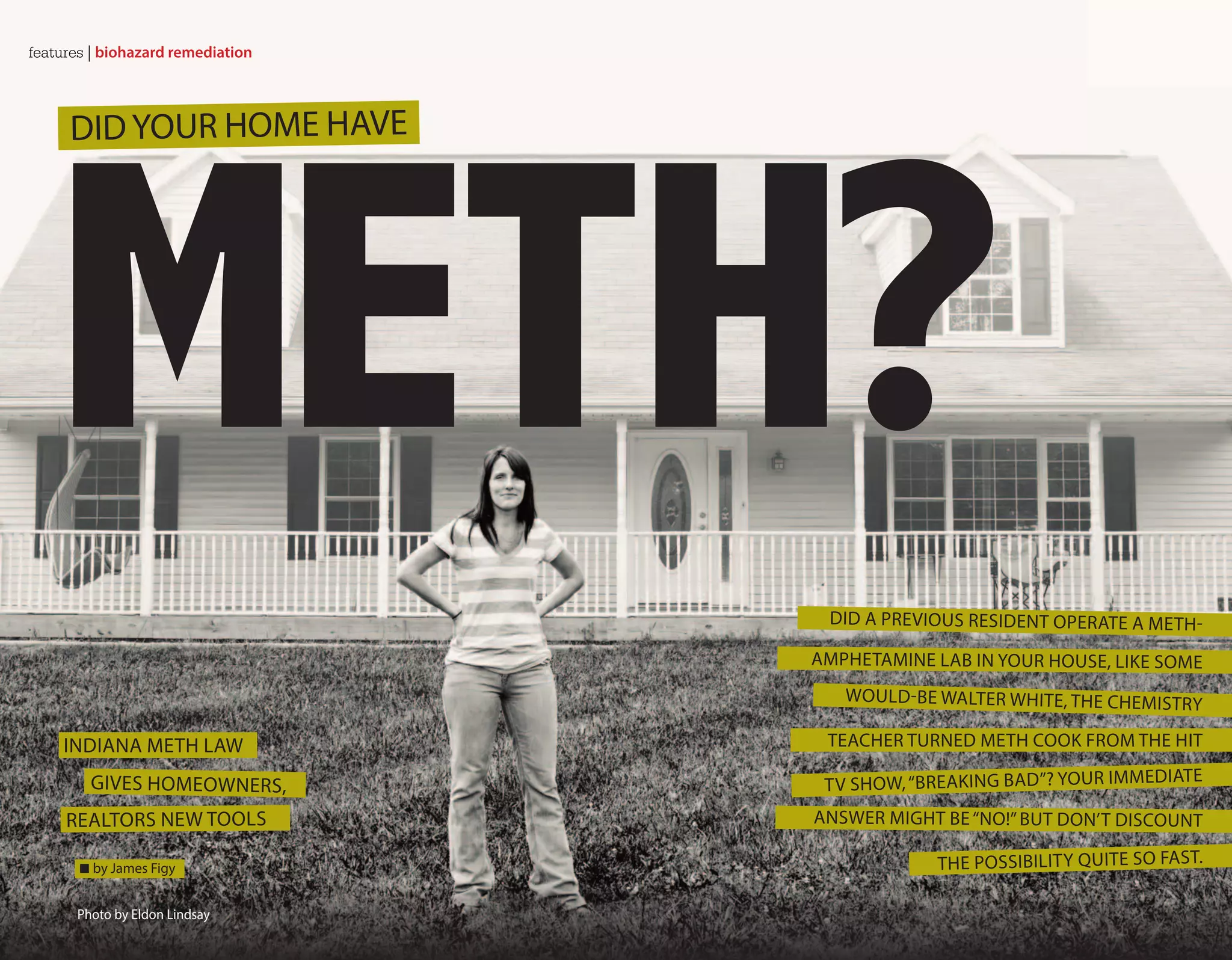 This document summarizes the issues surrounding methamphetamine contamination in homes in Indiana. It discusses a family who bought a home that had been used as a meth lab and how they and their children became sick after moving in. A new Indiana law now requires real estate agents to disclose if a home was previously used as a meth lab, to protect buyers. Cleaning up contamination can cost $5,000-$20,000, but some homeowners attempt to clean it themselves to save money. Indiana has ranked #1 for meth incidents reported to the FBI.