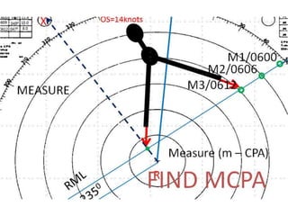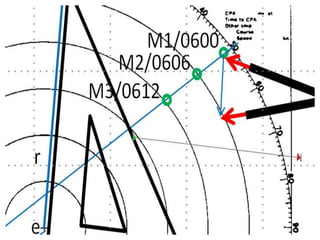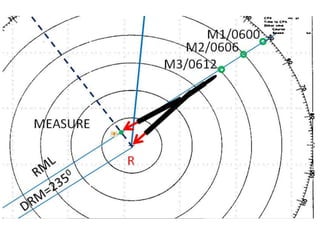 The document contains calculations and measurements related to radar tracking of an object over multiple observations. It includes details like speed, distance, time differences, and calculations to determine various motion parameters like closest point of approach, time to closest point of approach, and relative motion. The document shows the process of iteratively updating measurements and calculations as more observation data is obtained in order to fully characterize the object's motion.