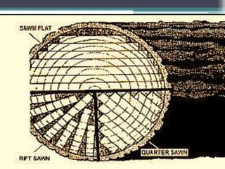 The document describes three common methods of sawing logs: plain sawn, quarter sawn, and rift sawn. Plain sawn produces the widest boards with the least waste but is less stable. Quarter sawn and rift sawn produce more stable boards that resist warping but are more wasteful to produce. Rift sawn is the most stable but also the most expensive due to the high amount of waste.
