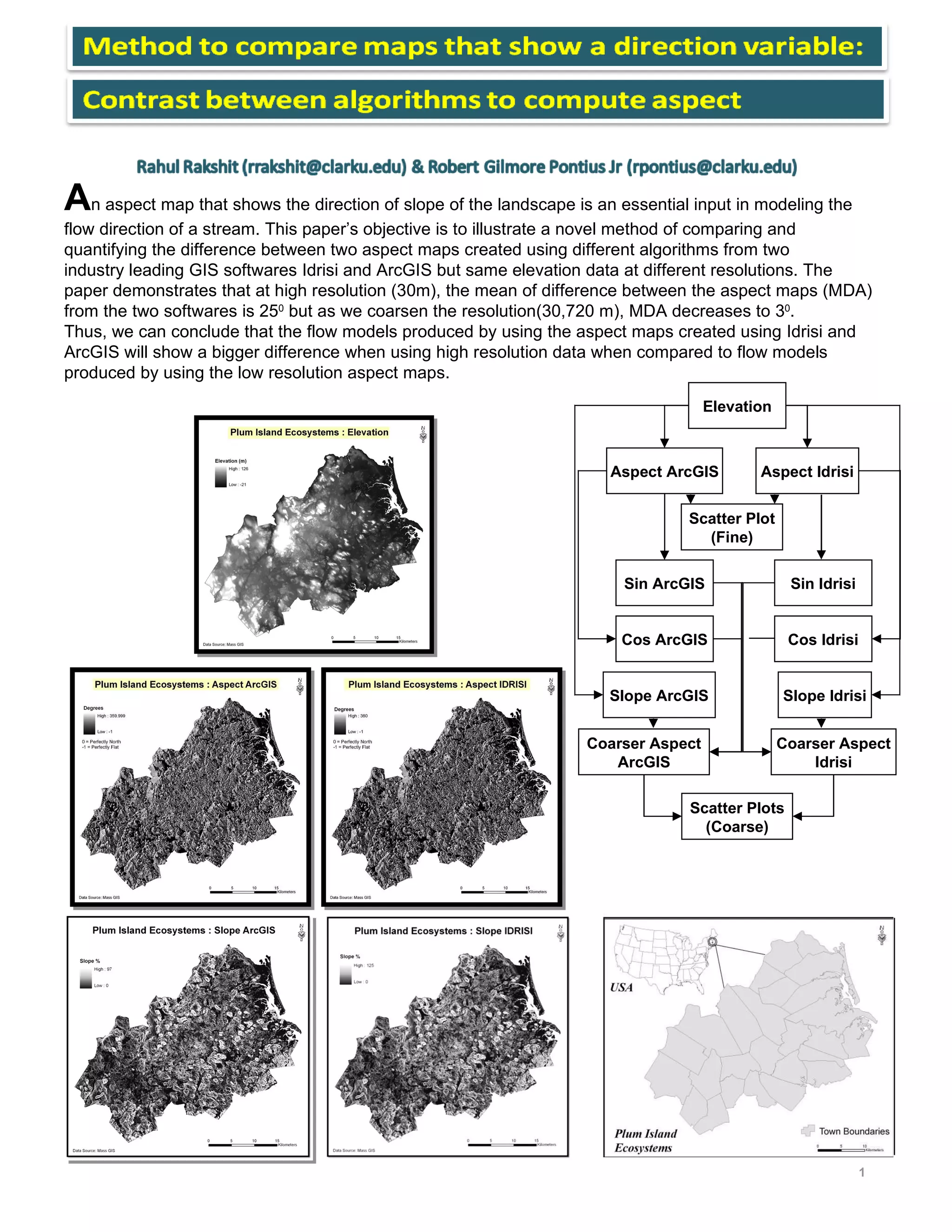 The paper compares aspect maps created from the same elevation data at different resolutions (30m and 30,720m) using two different GIS software programs, Idrisi and ArcGIS. It finds that at the higher 30m resolution, the mean difference between the aspect maps (MDA) is 25 degrees, but at the lower 30,720m resolution the MDA decreases to 3 degrees. Therefore, the aspect maps and resulting flow models produced by the two programs will show a larger difference when using high resolution data compared to low resolution data.