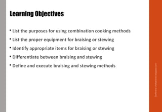 Braising and stewing are combination cooking methods that use both dry and moist heat. Dry heat is first used to sear the main ingredient to improve color and flavor. The ingredient is then cooked in liquid using moist heat, which softens the tissue and breaks down connective tissue. Braising involves cooking large cuts of meat covered in liquid in the oven, while stewing uses smaller pieces of meat and liquid that fully covers the ingredients and is cooked on the range or in the oven. Proper technique involves searing, adding aromatics and liquid to deglaze the pan, then slowly cooking until fork-tender before thickening and serving the sauce.