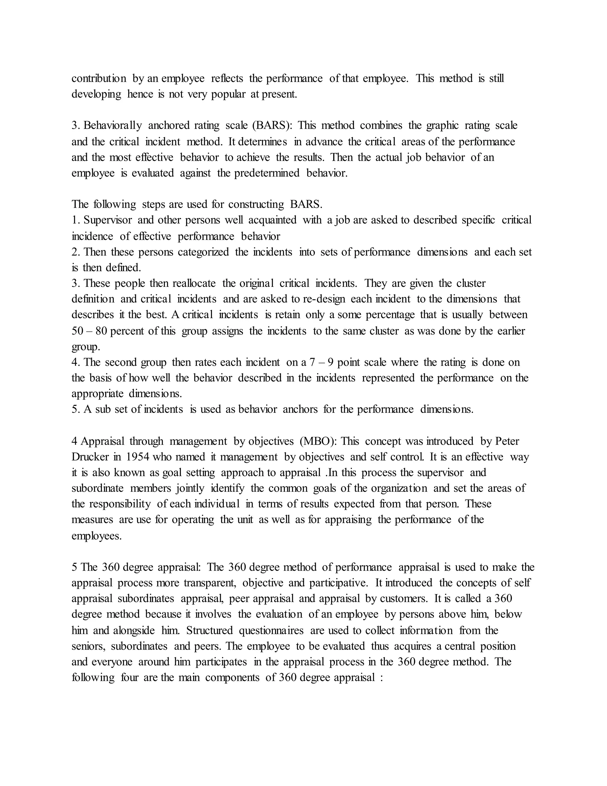 The document outlines various methods of performance appraisal, including traditional and modern techniques such as the assessment centre method, human resource accounting method, and 360-degree appraisal. It discusses the advantages and disadvantages of each method and provides a comprehensive view on how performance can be evaluated through multiple approaches. Additionally, the document offers resources and references for further assistance on performance appraisal topics.