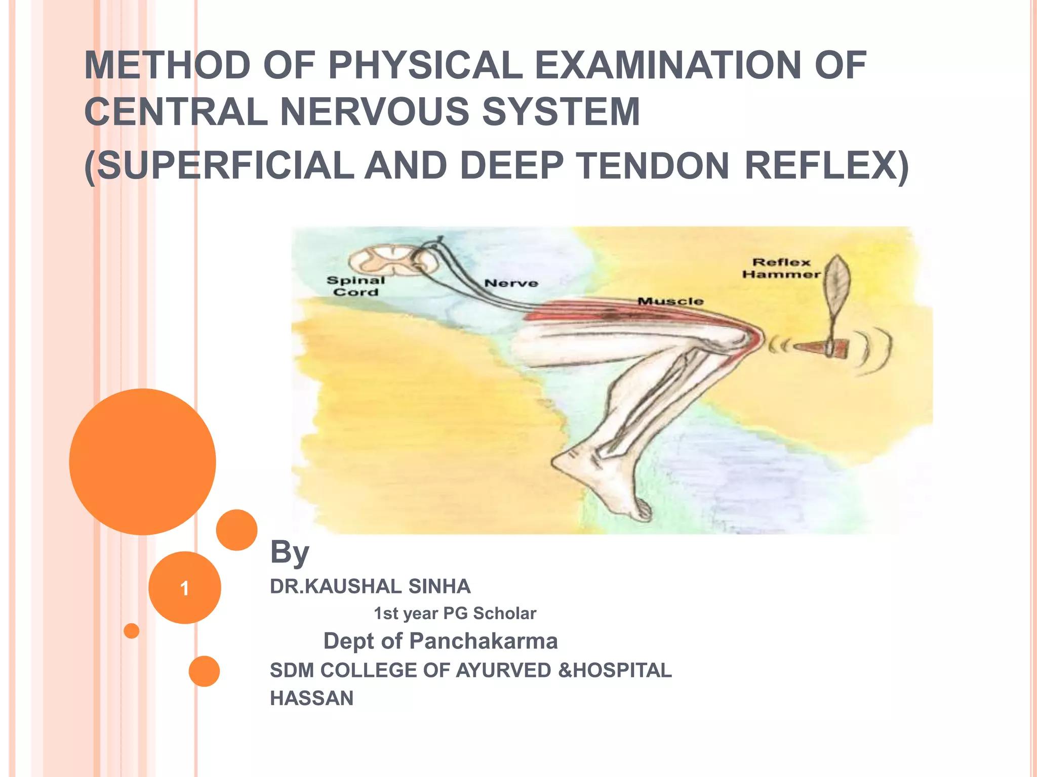 This document provides information on methods for examining central nervous system reflexes through superficial and deep tendon reflex tests. It describes the components and techniques for assessing several key reflexes, including: