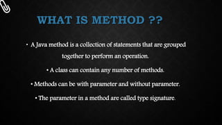 This document discusses method overloading in Java. Method overloading allows multiple methods to have the same name but different parameters. It demonstrates polymorphism. Methods can be overloaded by changing the number of arguments, data types of arguments, or return types. An example shows a class with multiple check methods that vary the parameters. The rules for overloading require changing the method signature by altering the number, type, or order of arguments but keeping the name the same. Advantages of overloading include cleaner code, increased readability, and flexibility to call similar methods for different data types.